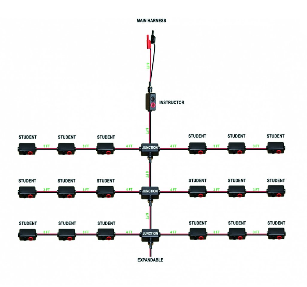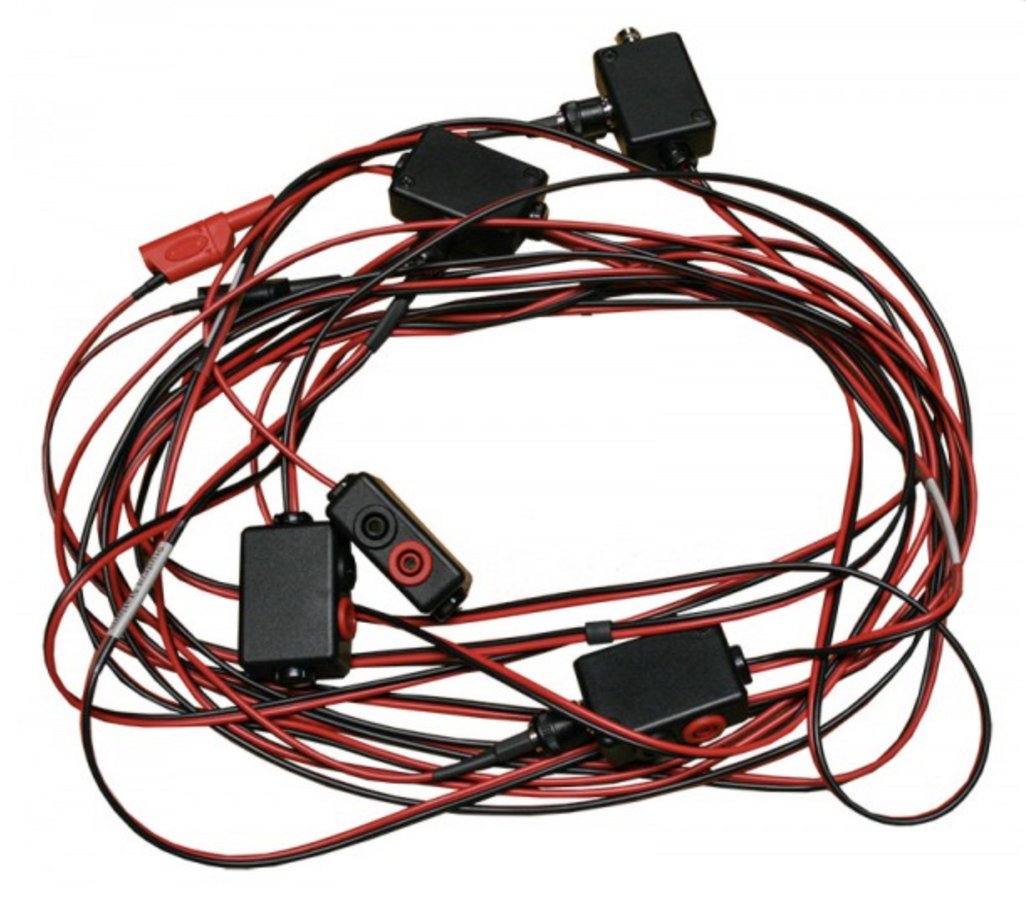 Contenu de l’ensemble | Les branches secondaires du réseau filaire sont reliées à la branche principale à l’aide de connecteurs BNC et comprennent des borniers pour raccorder des oscilloscopes, des multimètres ou d'autres instruments de test. Chaque boîte de jonction est munie d’une borne positive (rouge) et d’une borne négative (noire) pour y brancher des câbles à prise banane avec reprise arrière qui sont raccordés notamment à des instruments de mesure. |