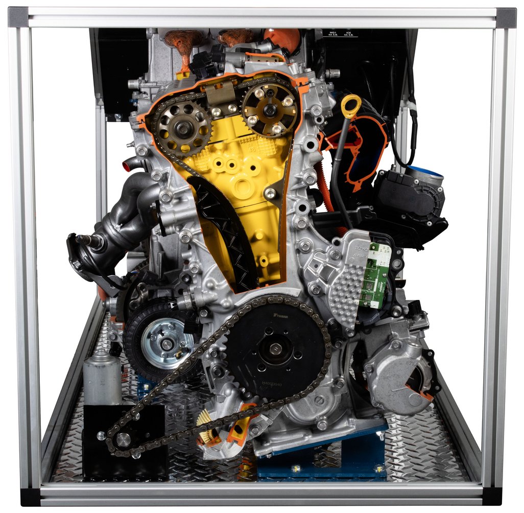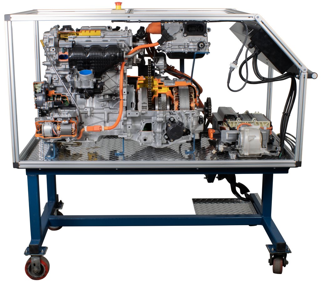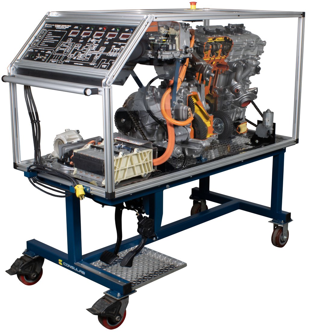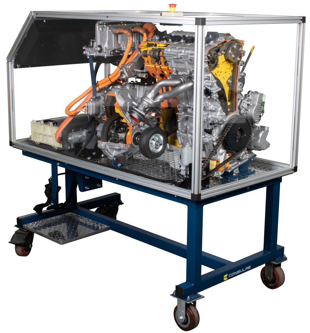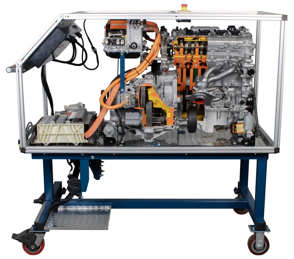 Attraits pédagogiques | Des coupes claires permettent aux étudiants de visualiser clairement les composants du groupe motopropulseur hybride. Permet d’observer huit (8) modes de conduite du système hybride. Absence d'alimentation haute tension associée au véhicule hybride pour fins pédagogiques. Caisson transparent en feuilles PETG pour empêcher l'accès aux pièces tournantes. Poste de commande convivial montrant le flux énergétique, la vitesse et le sens de rotation des moteurs. Moteurs électriques entraînant le moteur à combustion interne, MG1 et MG2. Permet d’observer le fonctionnement du ratio variable continu à l’aide d’un répartiteur de puissance à trains planétaires et d'un variateur de vitesse d’entrée. |