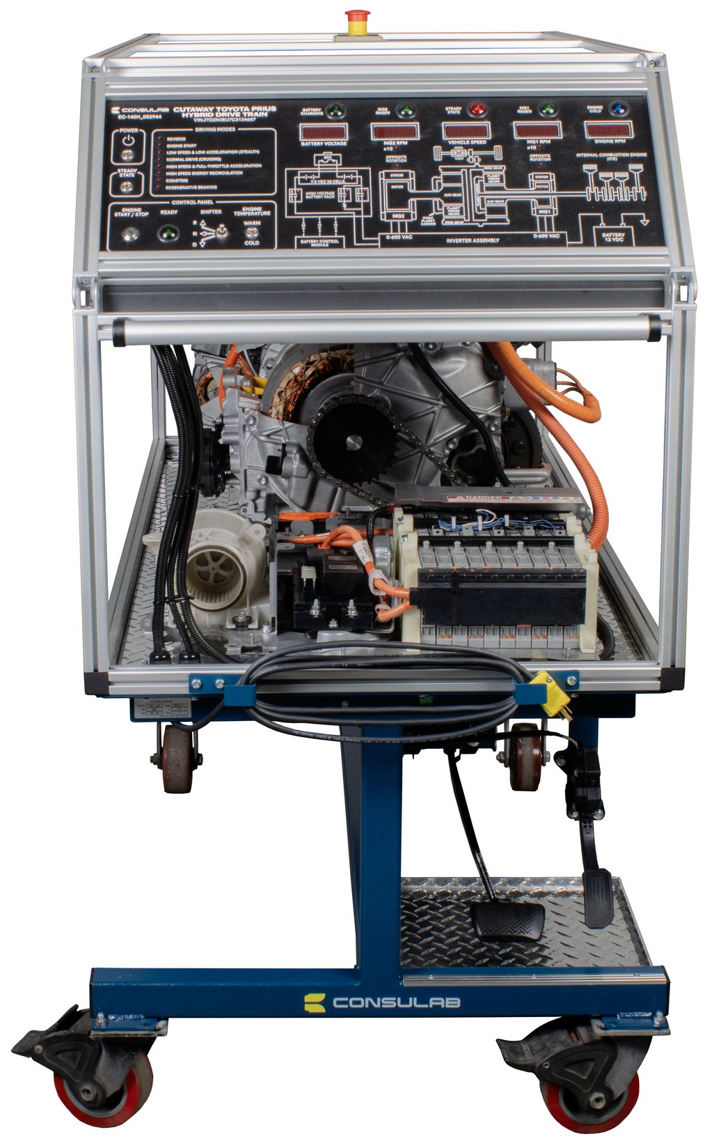 Caractéristiques | Composants, câblage, connecteurs et couleurs de fils d'origine. Alimentation à 120 VCA, 60 Hz avec Interrupteur marche-arrêt principal et fusible de protection de 1,5 A. Banc mobile construit en tubes d'acier de 5 cm² (2 po2) équipé de quatre roulettes en phénol de 12,7 cm (5 po), dont 2 sont fixes et 2 sont pivotantes avec verrous. Poste de commande. Section d’entraînement hybride synergétique comprenant des témoins lumineux pour la recharge de batterie, le blocage de mode, la récupération d'énergie par MG1 et MG2, le moteur thermique à froid, des afficheurs numériques pour la charge de batterie, la vitesse rotative de MG1 et de MG2, et la vitesse du véhicule, deux indicateurs à DEL pour le sens de rotation des moteurs, deux indicateurs DEL pour le démarrage du système d’alimentation ainsi qu’un schéma représentant le système hybride. Pédale d’accélération. Pédale de freinage. Bouton d’arrêt en cas d’urgence. Batterie haute tension non fonctionnelle. |