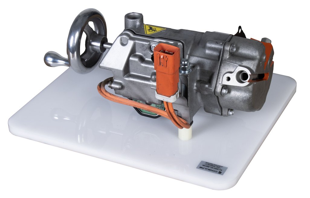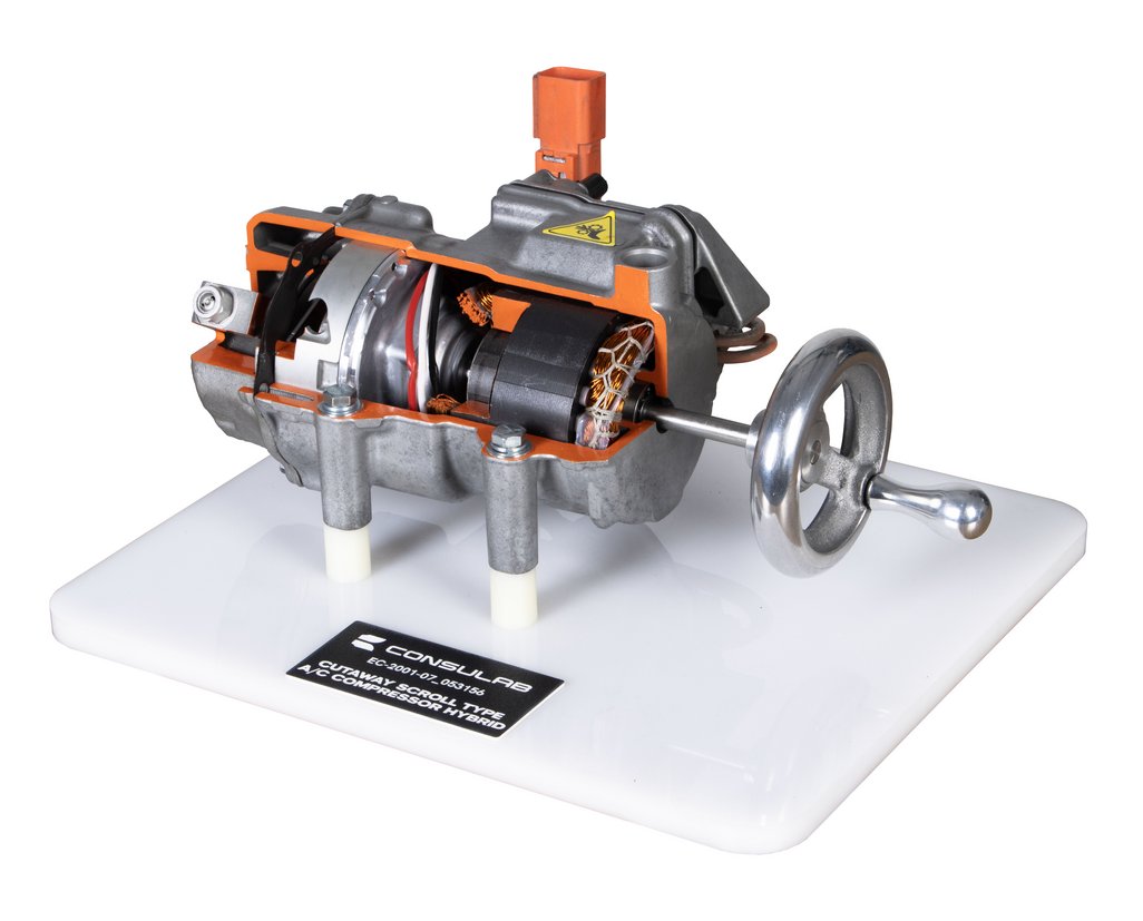 Attraits pédagogiques | Permet de démontrer le fonctionnement des compresseurs de climatisation à spirales pour véhicules hybrides, entraînés par un moteur électrique triphasé. Modèle en coupe actionné par manivelle. |
