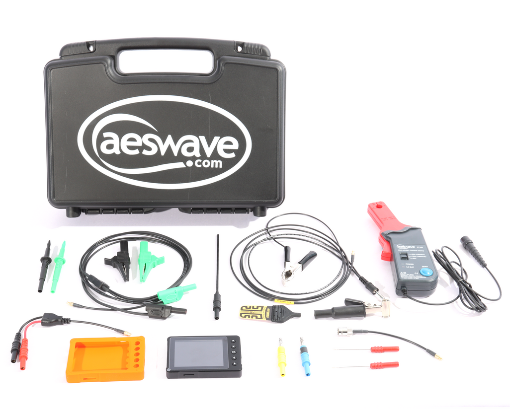 Kit Contents | uScope Digital Storage Oscilloscope Protective boot (orange) Low Current Amp Probe (10mA - 60A) Shielded test lead (5-ft) Secondary lead (5-ft) with plug wire clamp COP paddle AC filter Primary ignition probe (attenuator) Alligator clips (black & green) 2mm pin tip probes (black & green) EAP backpinning probes (2) Adapter for BNC connector Adapter for banana plug 2GB micro SD card Micro USB cable 3.5mm mini phono plug for signal generator Hard carrying case User manual |