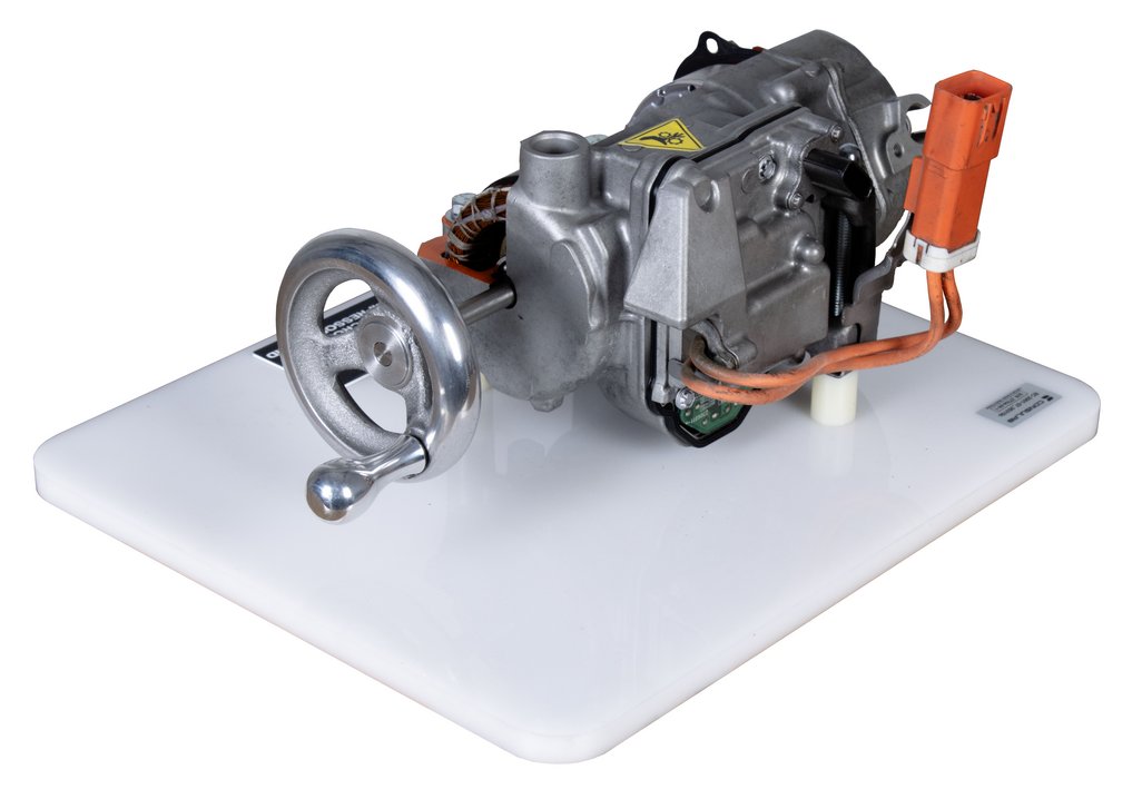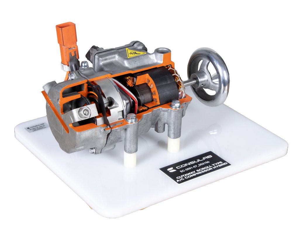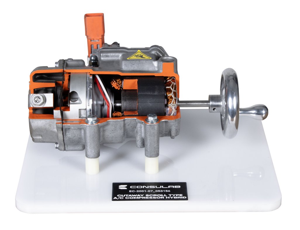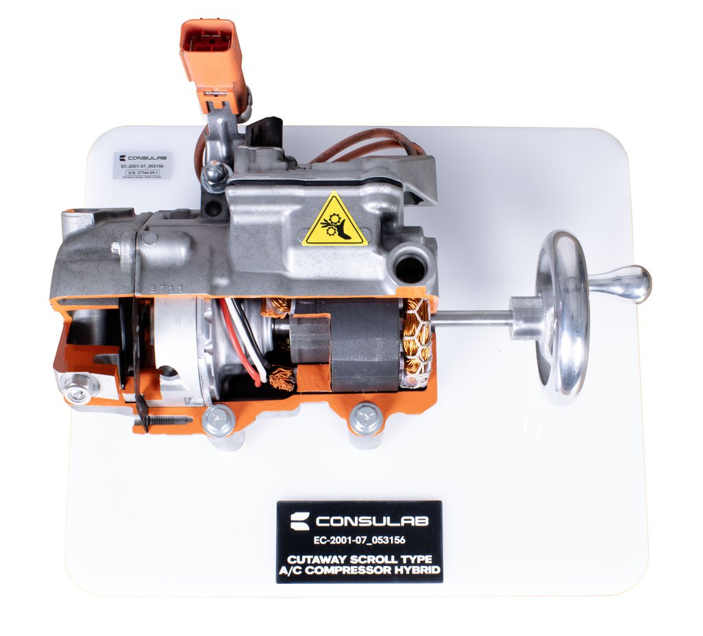 The EC-2001-07 allows students to see the internal operation of the electrically driven hybrid scroll type A/C compressor. The 3-phase electric motor that drives the compressor can be rotated using a hand crank.