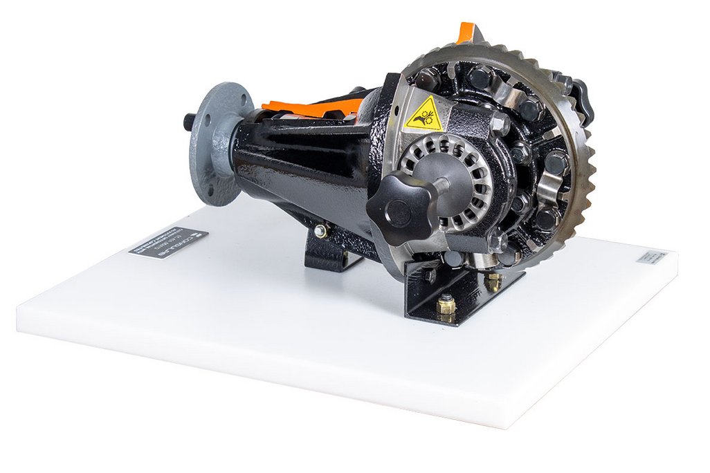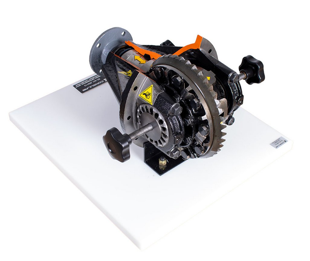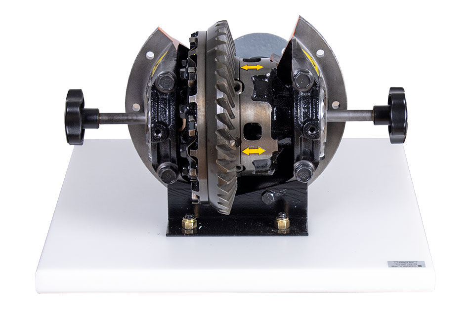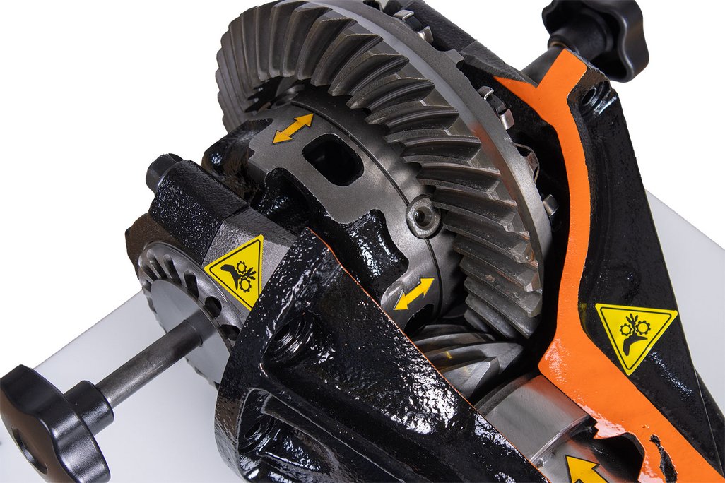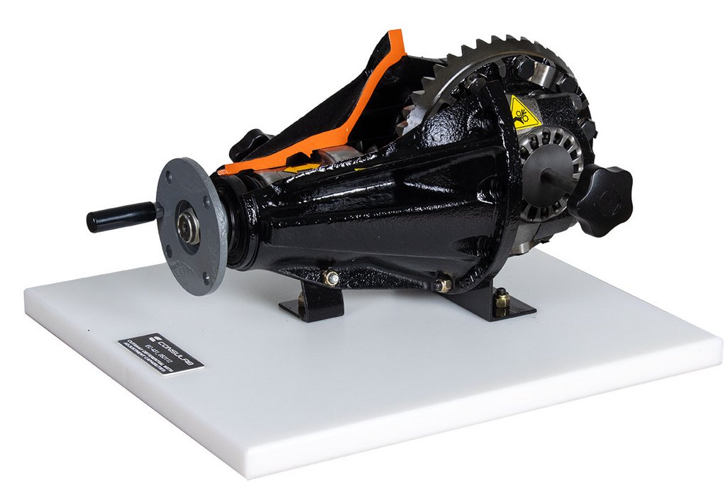 Features | Provides full visibility and accessibility to all components without the limitations of working under a vehicle. Takes the mystery out of differential operation. Sits on a bench or tabletop to allow more student access and visibility of component operation. Demonstrates how movement of the differential components affect adjustment. Cutaway assembly to easily show components. Uses repurposed “real” automotive components. Engages multiple students for operation of trainer. Provides ability to make and check common adjustments Provides ability to visualize differential gear movement |