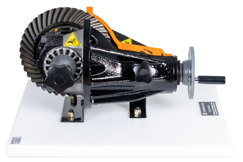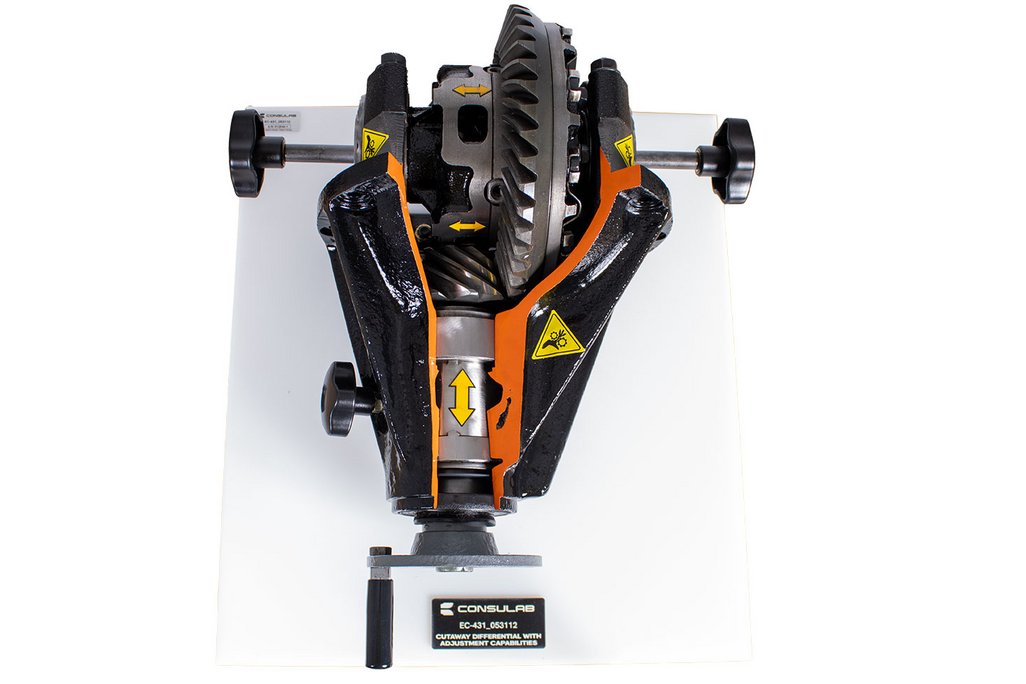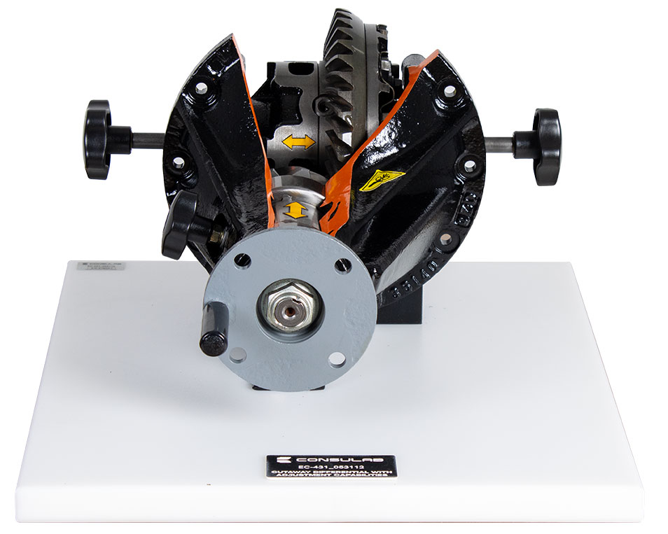 Educational Advantages | Provides component identification exercises for students. Allows demonstration of proper design and location of common differential parts and components. Instructors can easily demonstrate the operation of a typical differential. The EC-431 provides hands on learning by moving the pinion gear in and out of mesh with the ring gear and allows adjustment of the ring gear position by changing the backlash using hand adjustments. Provides visualization of backlash adjustment Provides visualization of pinion depth position Provides visualization of calculating gear ratio |