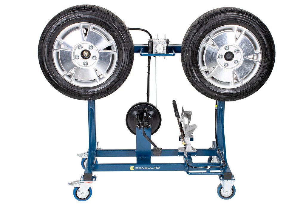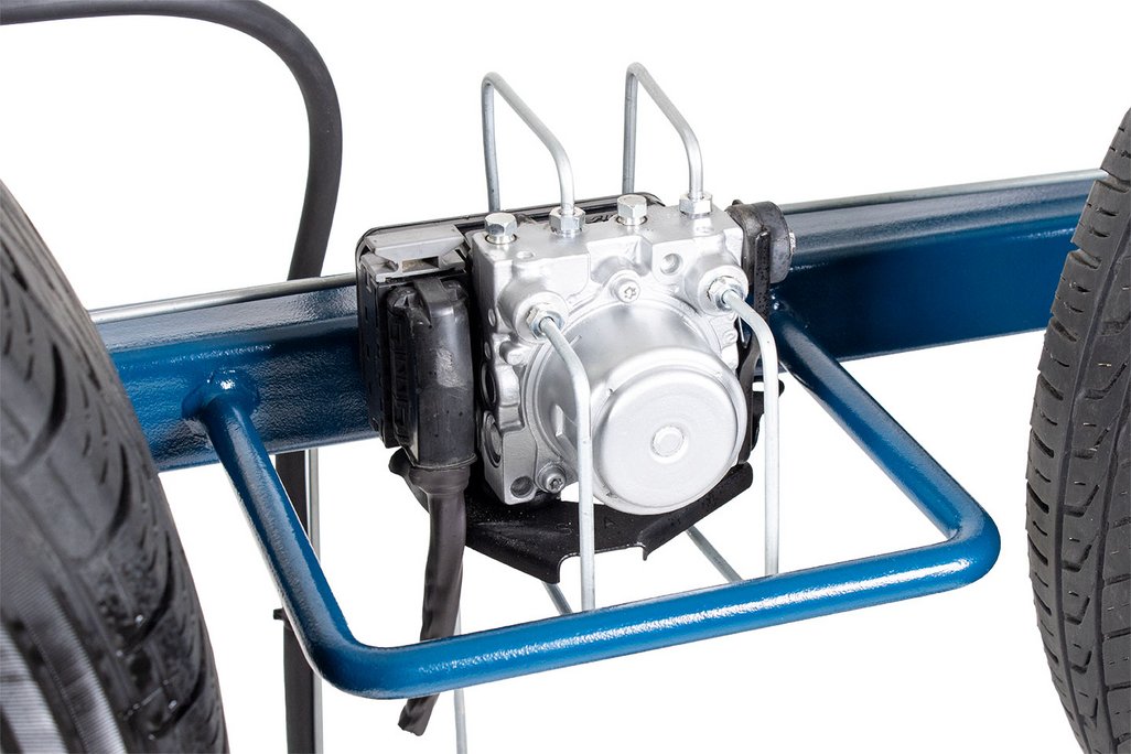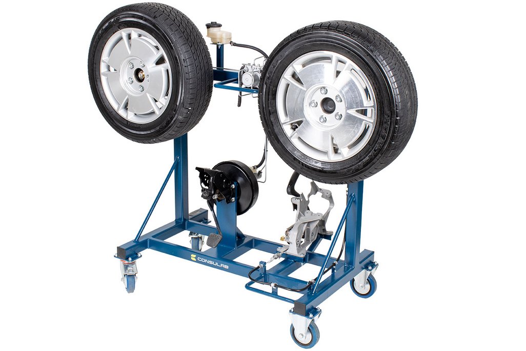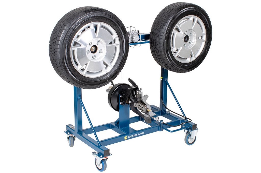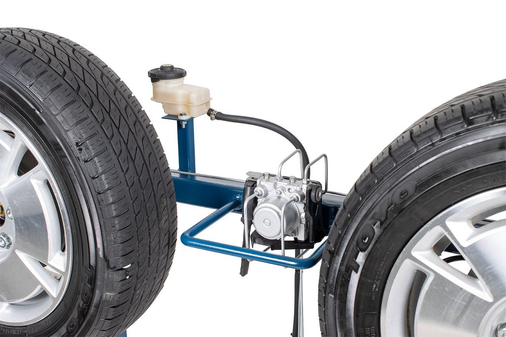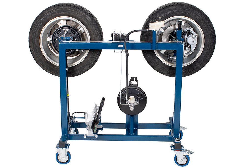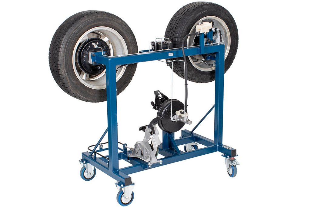 Features | Real OEM automotive components with fully functional disc/drum hydraulic braking system including: All OEM hydraulic components OEM Brake pedal and parking brake pedal OEM Power brake booster OEM ABS components and hydraulic plumbing (non-functional) OEM Parking brake components Fully functional parking brake system Fits through a standard 30” door opening Heavy duty metal stand with casters for easy transport (two fixed and two swivel w/locks) All routine brake service procedures can be performed on this trainer including: Master cylinder service Power brake booster service Brake pad/shoe replacement Disc/Drum service Wheel bearing service Caliper/Wheel cylinder service Brake hose/line service Parking brake service |