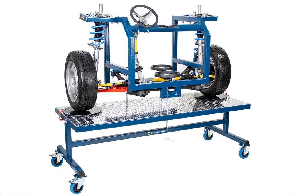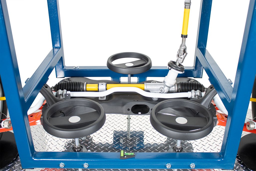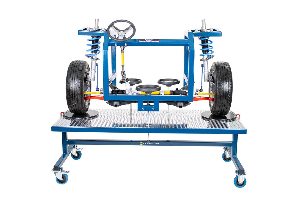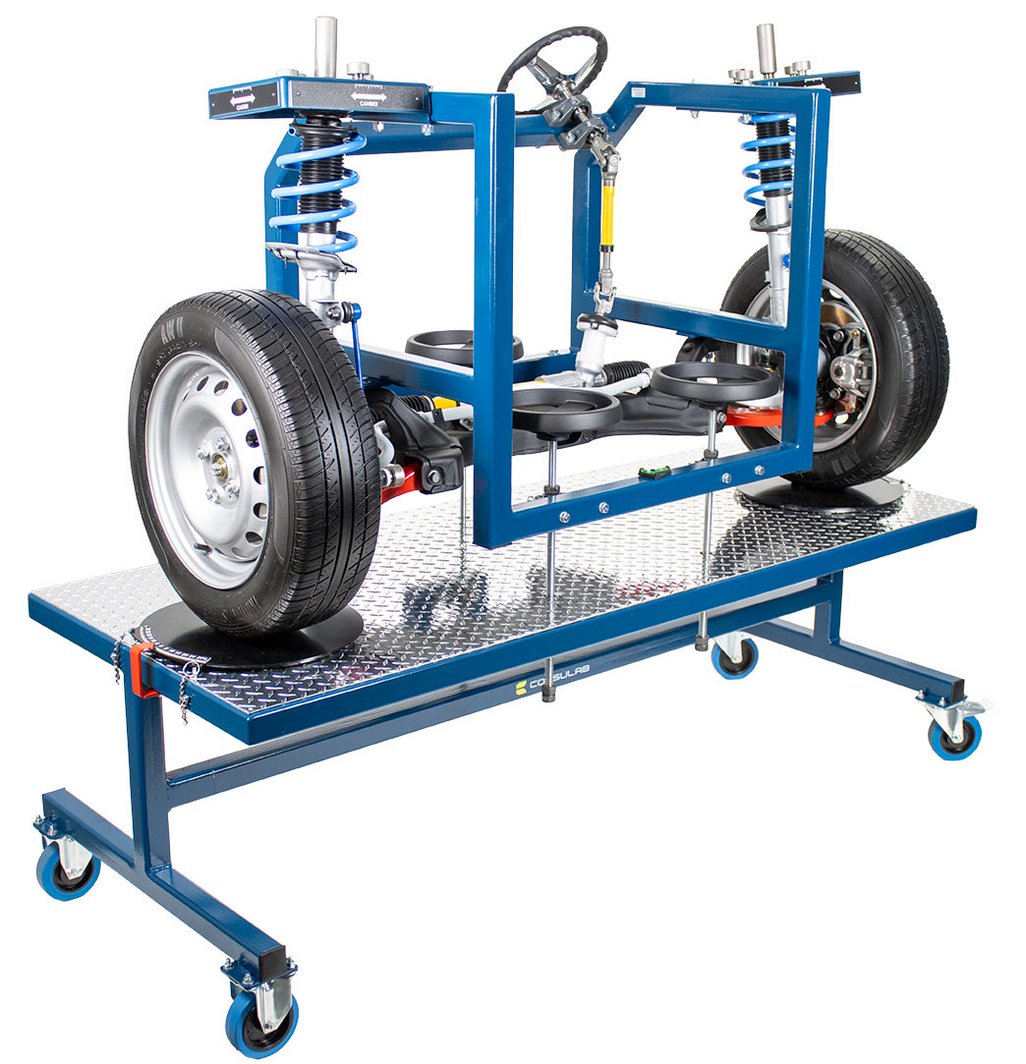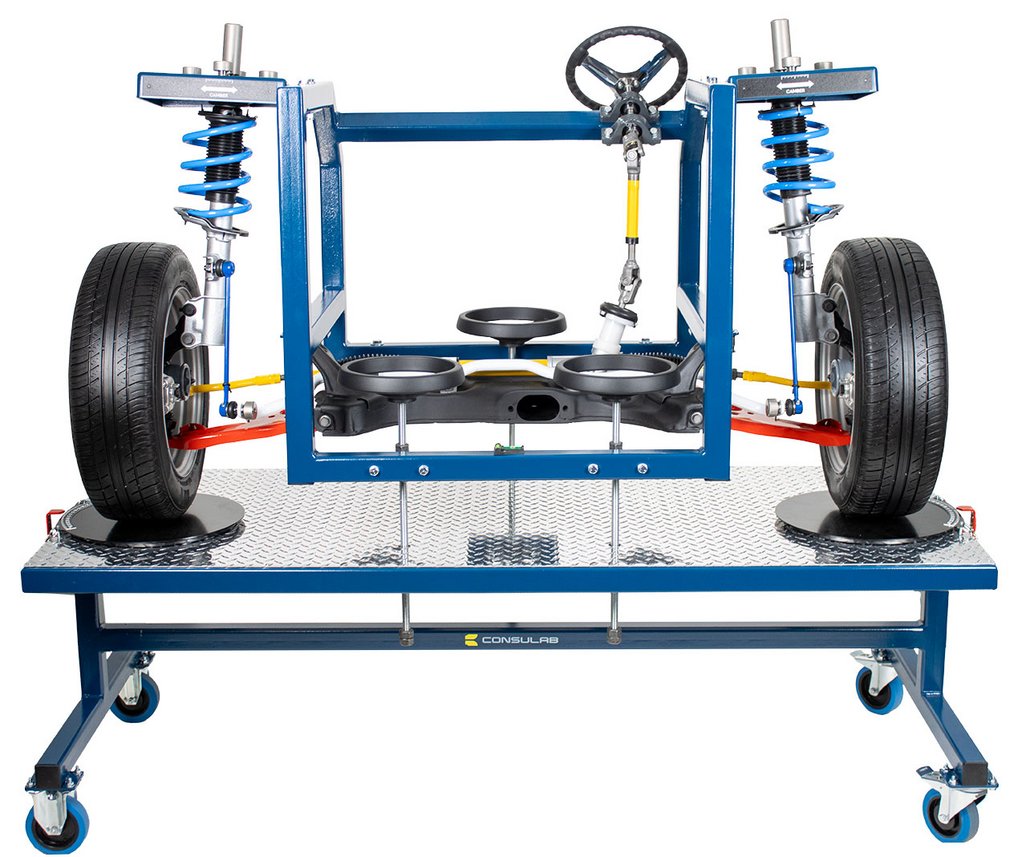 Educational Advantages | Provides full accessibility of vehicle components without access limitations of a real vehicle Alignment demonstrations, measurement and adjustments can be accomplished with clear viewing by students Component identification of a typical MacPherson strut suspension system Component identification of a typical rack & pinion steering system Component identification of a typical sway & stabilizer bar Front bearing hub and wheel bearing service Make, measure and observe changes of Caster, Camber and Toe The EM-130 trainer can be used for student identification of a typical disc brake system. Students can practice wheel & tire service Students can practice brake caliper and rotor service Students can practice rotor (T.I.R.) runout and thickness measurements Students can practice brake condition inspection The EM-130 trainer can be used for the instruction and practice of common MacPherson strut and rack & pinion steering service procedures including : rack removal and reinstallation, inner & outer tie rod service andsStrut and ball joint service The trainer allows superior component visualization and allows actual measurement of camber, caster and SAI using the included magnetic gauge. Students can easily make adjustments and view the results of the changes. Students can also view the following alignment concepts on the trainer : SAI (STEERING AXIS INCLINATION), total included angle and side-to-side differences in caster, camber and toe |
