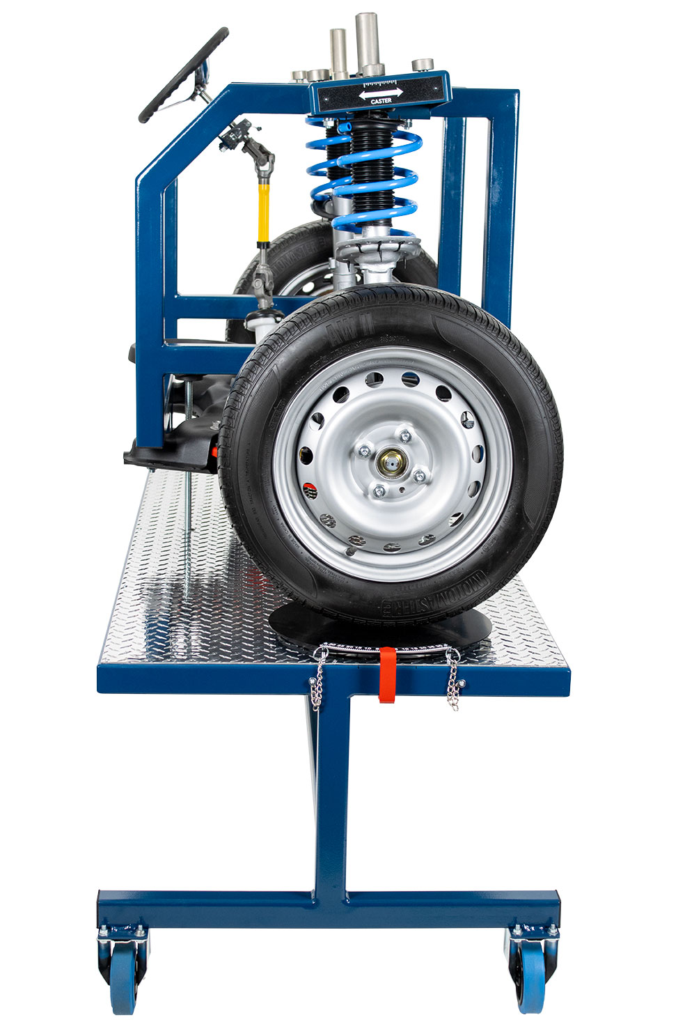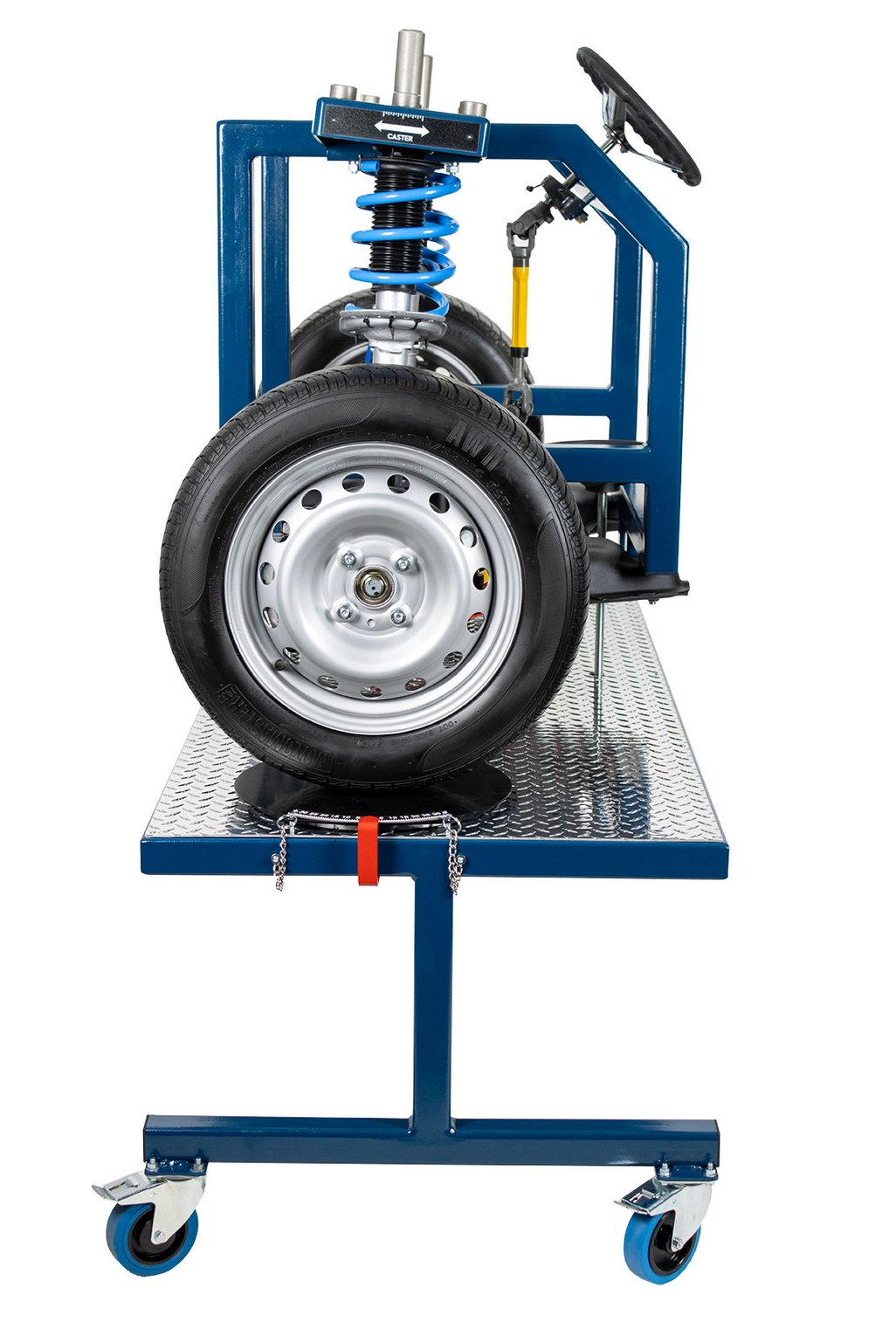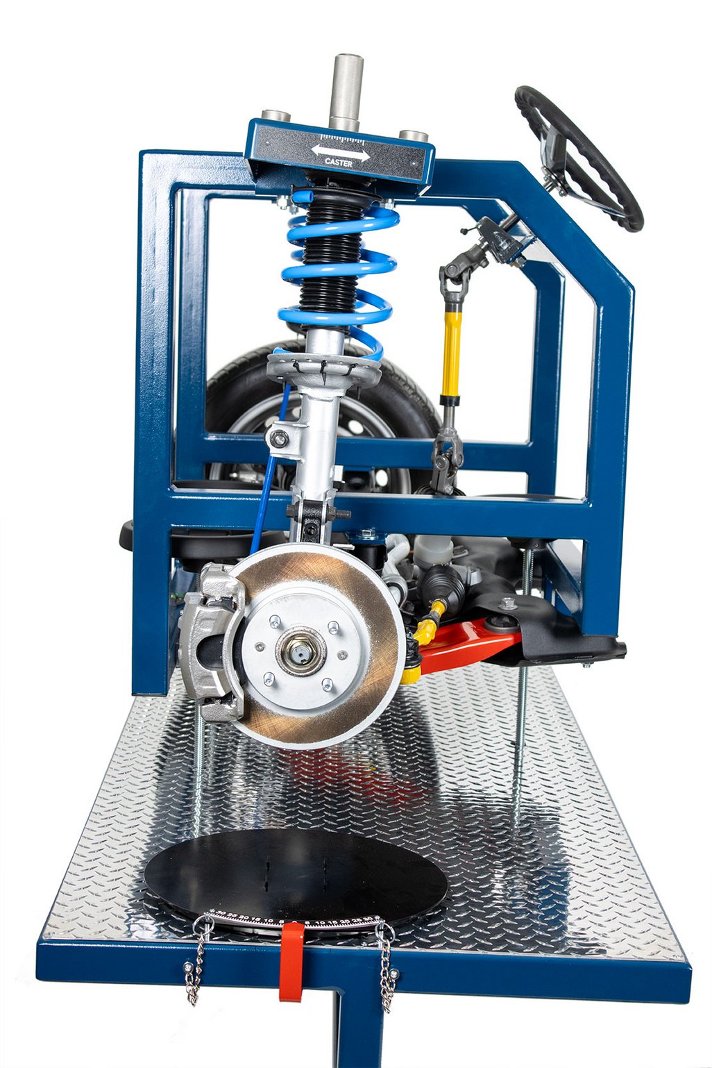 Educational Advantages | Provides full accessibility of vehicle components without access limitations of a real vehicle Alignment demonstrations, measurement and adjustments can be accomplished with clear viewing by students Component identification of a typical MacPherson strut suspension system Component identification of a typical rack & pinion steering system Component identification of a typical sway & stabilizer bar Front bearing hub and wheel bearing service Make, measure and observe changes of Caster, Camber and Toe The EM-130 trainer can be used for student identification of a typical disc brake system. Students can practice wheel & tire service Students can practice brake caliper and rotor service Students can practice rotor (T.I.R.) runout and thickness measurements Students can practice brake condition inspection The EM-130 trainer can be used for the instruction and practice of common MacPherson strut and rack & pinion steering service procedures including : rack removal and reinstallation, inner & outer tie rod service andsStrut and ball joint service The trainer allows superior component visualization and allows actual measurement of camber, caster and SAI using the included magnetic gauge. Students can easily make adjustments and view the results of the changes. Students can also view the following alignment concepts on the trainer : SAI (STEERING AXIS INCLINATION), total included angle and side-to-side differences in caster, camber and toe |
