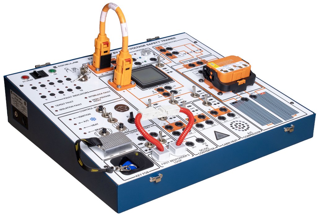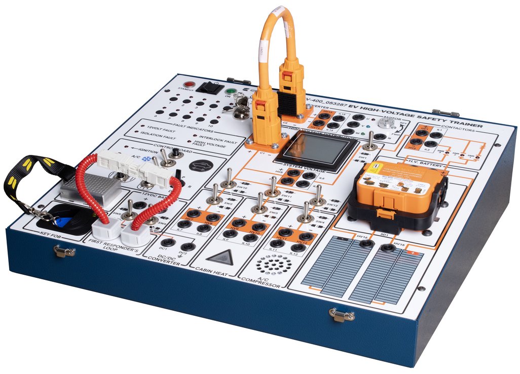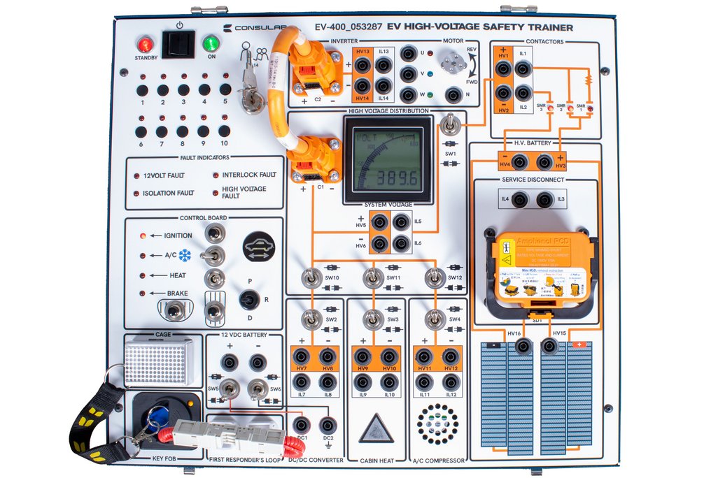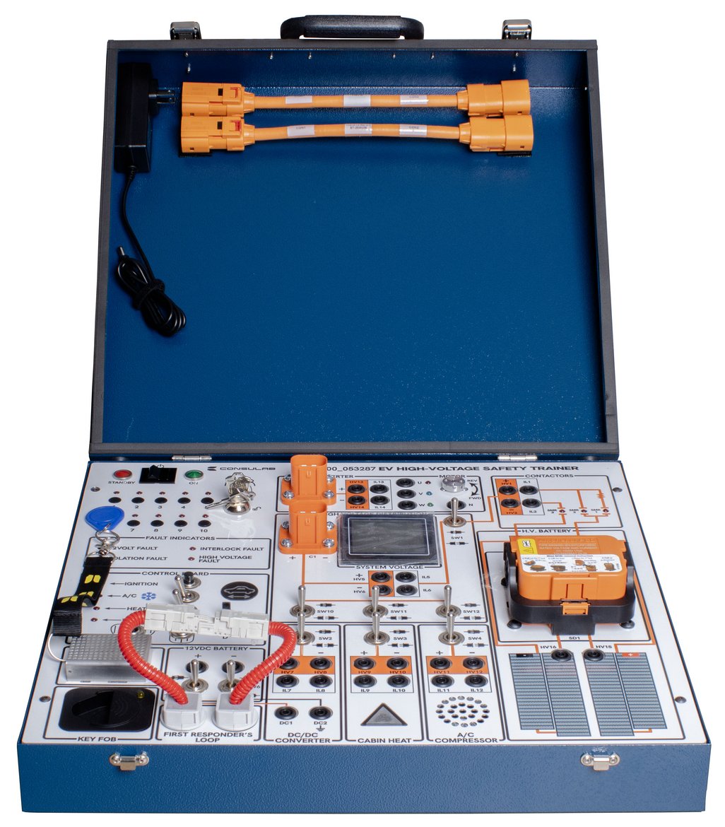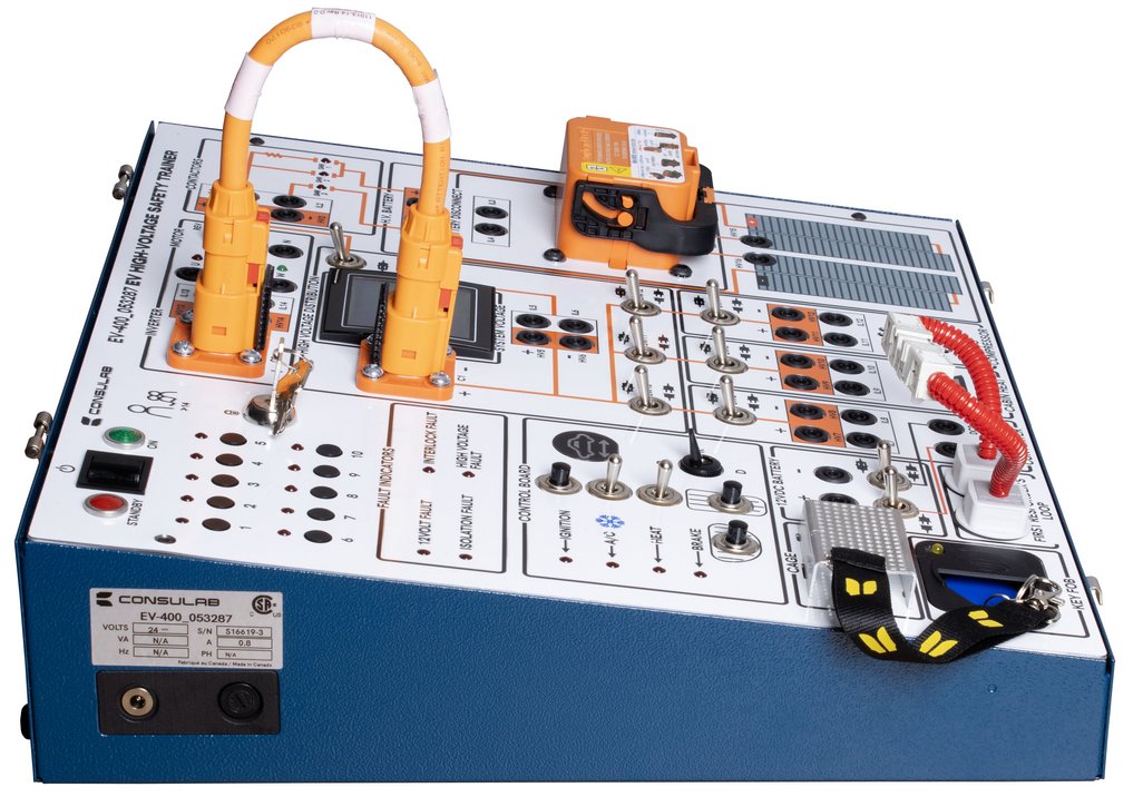The EV-400 EV High-Voltage Safety Trainer represents a fully functional battery electric vehicle (BEV) in a compact classroom sized package. It provides an intuitive, hands-on experience for high-voltage testing, Personal Protective Equipment (PPE) use including gloves and insulated tools, high voltage isolation testing with a mega-ohmmeter, high voltage interlock circuits, first responders’ loops, three phase motor control, high voltage power distribution, and much more. The product has a fault box and a faulty component, allowing diagnostic practice. The system reacts as a real BEV, demonstrating functions of various scenarios and components. All in a completely safe, controlled, classroom environment.The ConsuLab EV-400 High-Voltage Safety Trainer includes student assignments and practical exercises that (when combined with the required prerequisites) prepare a technician or instructor to successfully complete the CSA Group Automotive Electric Vehicle Technician Certification.This innovative product is perfect for: Technical training programs: automotive, electrical engineering, emergency response. Educational institutions: motive power trades, vocational schools, community colleges, and high schools. EV manufacturers and repair shops: upskilling technicians and ensuring safety protocols.