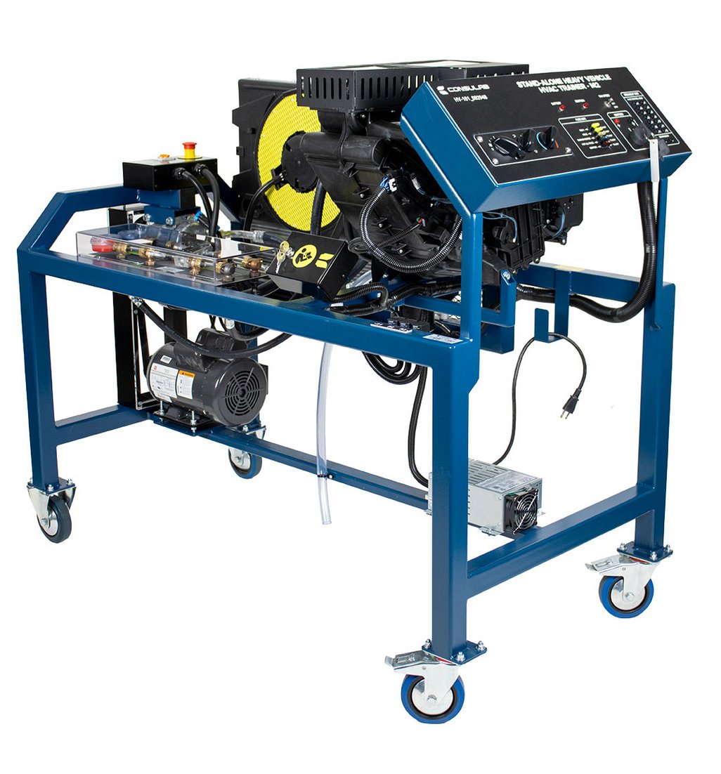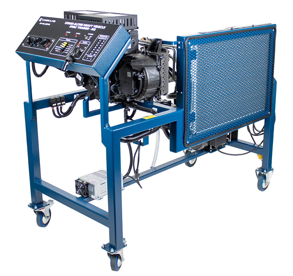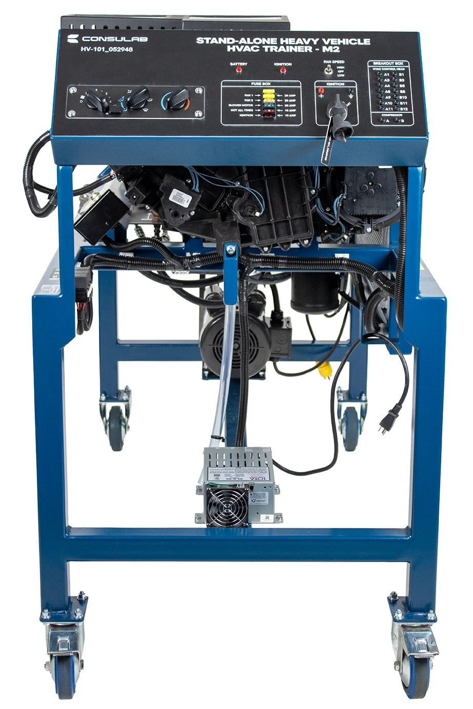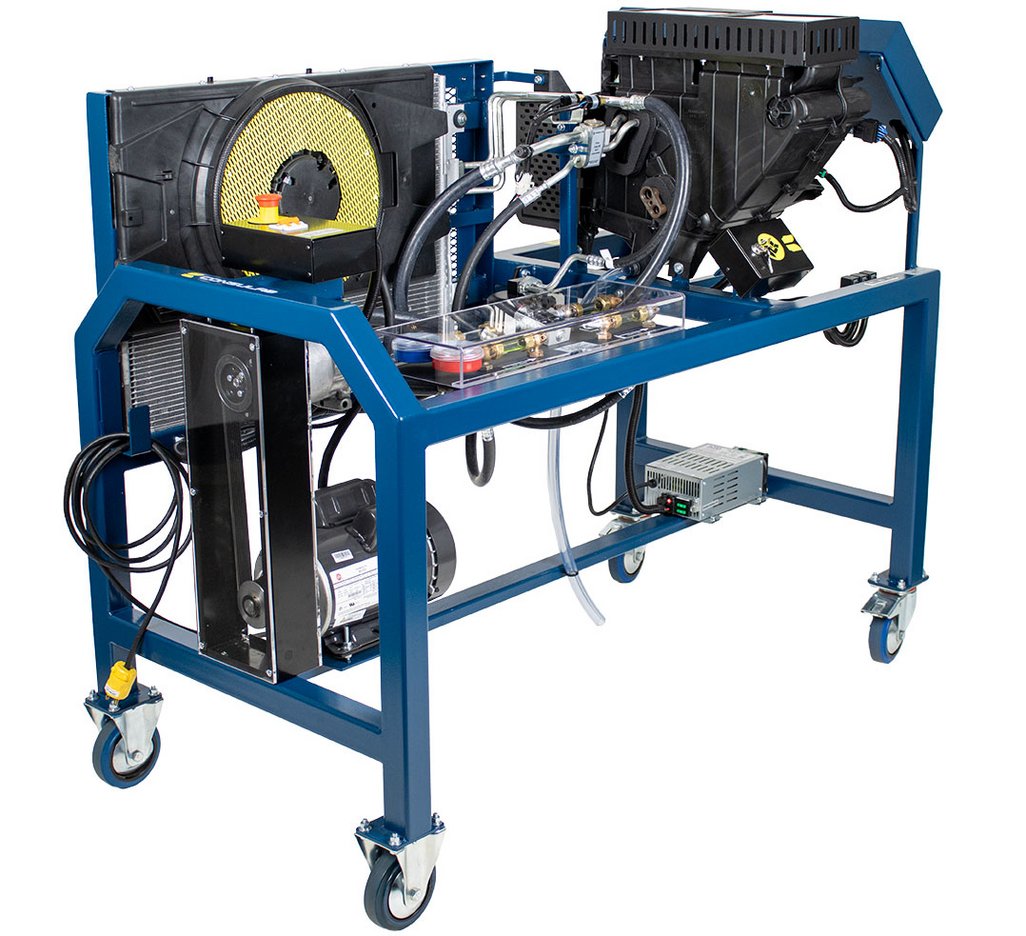 Features | Fully functional original equipment HVAC system based on the Freightliner Business Class M2 commercial truck Sanden A/C compressor, model 4314/ SD7H15 Using all new OEM components Trainer is mounted on a heavy duty bench with casters (2- swivel w/brakes and 2- fixed) Break Out Box for A/C control module with electrical test points sized for test equipment High and Low Side clear sight glasses for student observation of refrigerant change of state A/C Service Ports for high and low side Additional High and Low Pressure Safety Control switches Motor switch Uses OEM TXV H-block valve Electrical panic disconnect button 16 Electrical test points on A/C control module. Lockable Manual Fault Box with four (4) faults. |