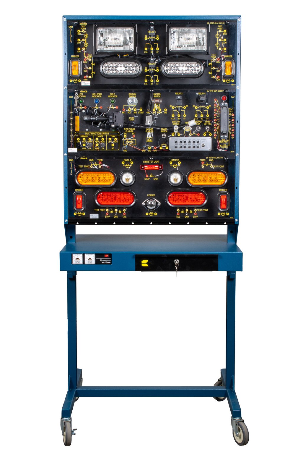 Features | 4 mm sockets for wiring circuits. 2 mm sockets for hookup of testing equipment. Standard automotive components are used. Upright stand will fit through a standard door. 4 swivel casters with 2 locking casters. Stand is made of steel with a sturdy power coated finish. Jumper wire holders included. Lockable storage drawer on each side. Built-in internally protected power supply. Includes Operation Instructions, Student Assignments and Instructor manuals |