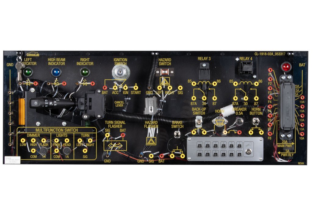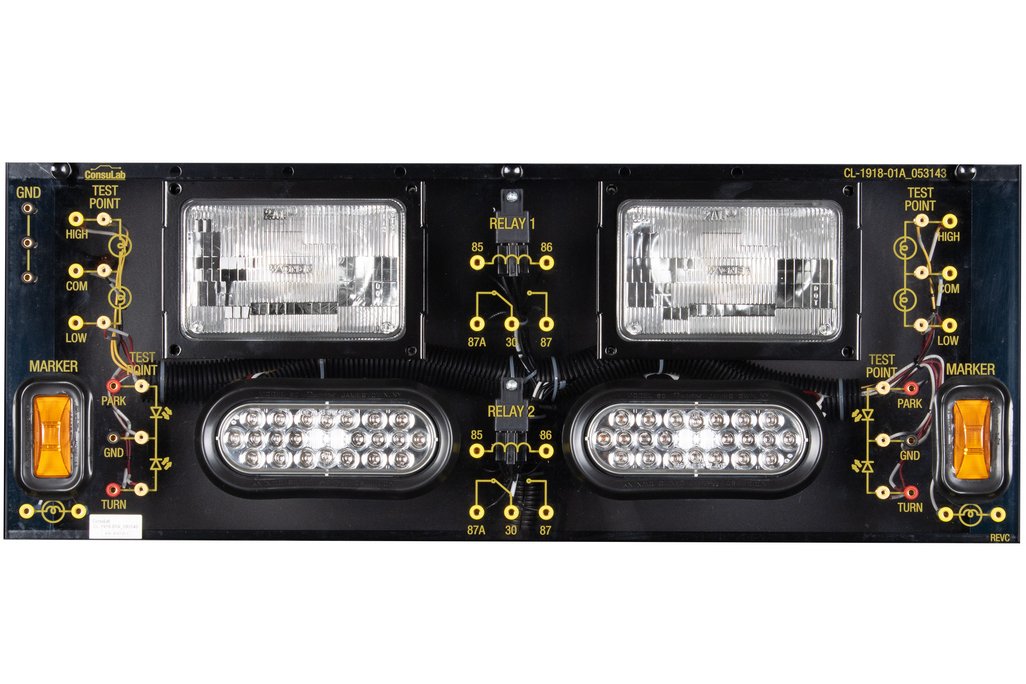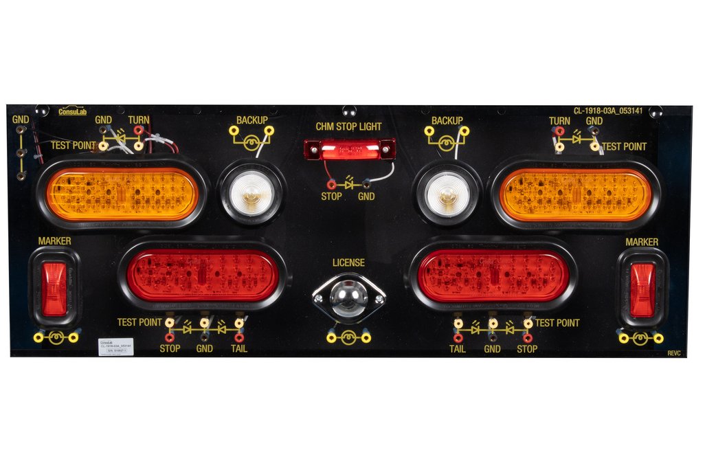 Educational Advantages | Students can build a complete lighting system or individual circuits Includes Head (incandescent), Park/Tail, Stop, CHMSL, Hazard/Turn (all LED), side marker, license plate and backup (incandescent), horn, ignition switch and fuse box. Students learn from “hands-on” assignments and activities written at three different competence levels. Can easily be used for instruction of Ohm’s and Kirchhoff’s Law’s. Fault box provides “real-world” problems requiring diagnosis and repair procedures. Uses industry standard electrical wiring schematics (advanced level) Available double-sided trainers maximize student engagement and space utilization. Robust design allows students to make mistakes without damage to the trainer. Trainer has four ISO 5-pin relays with one being removable for testing and replacement |