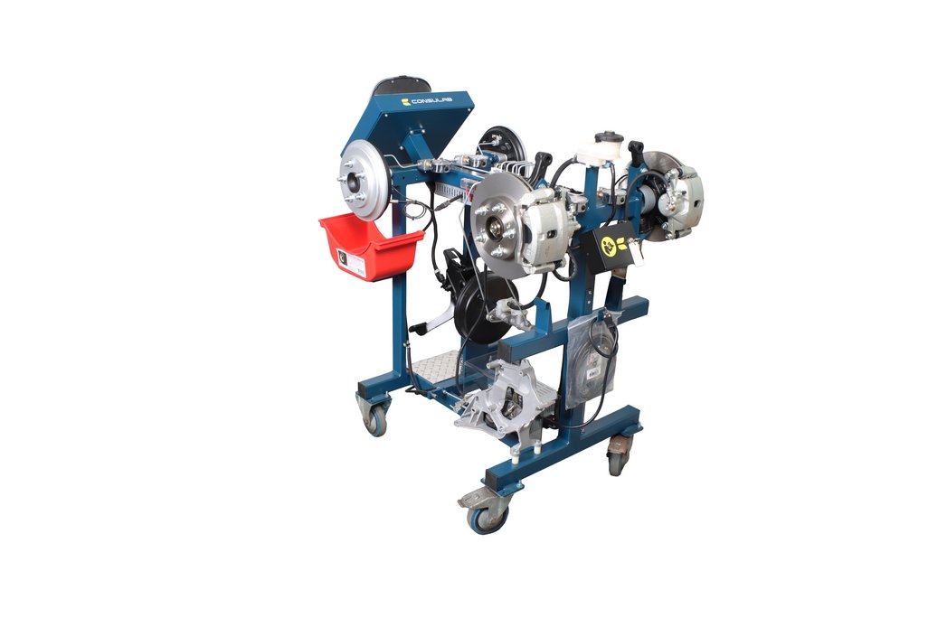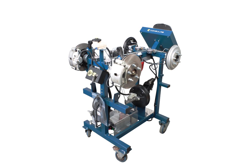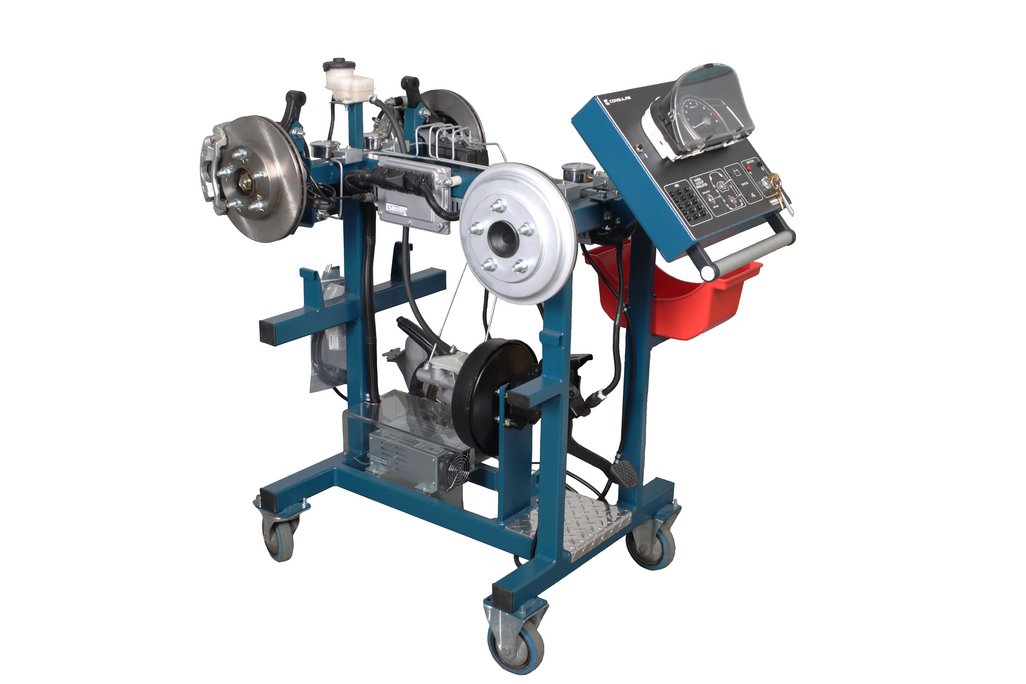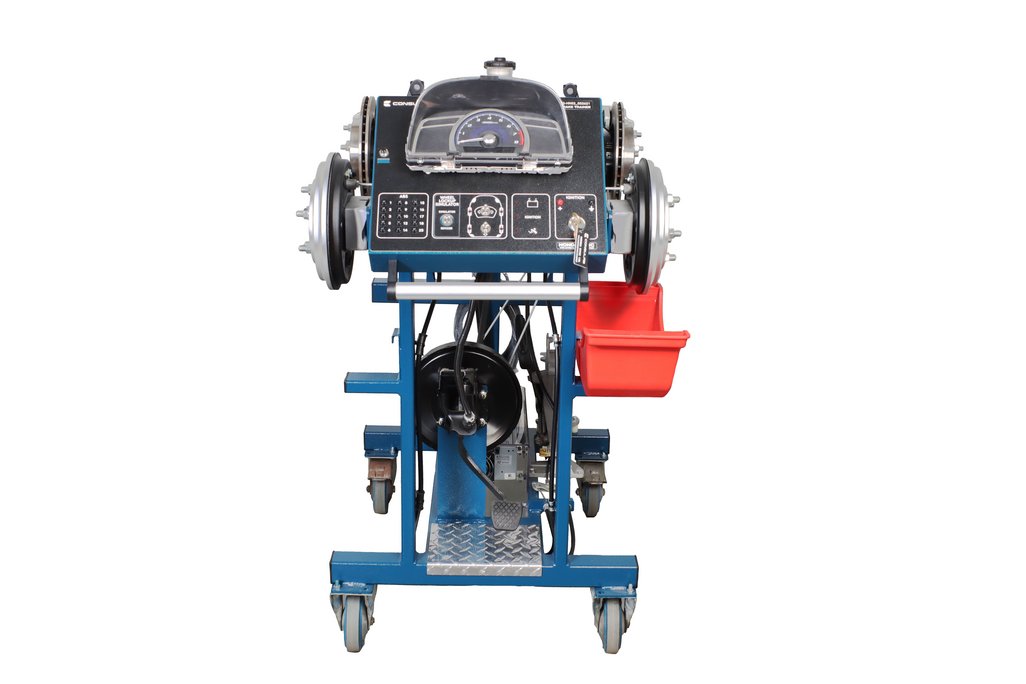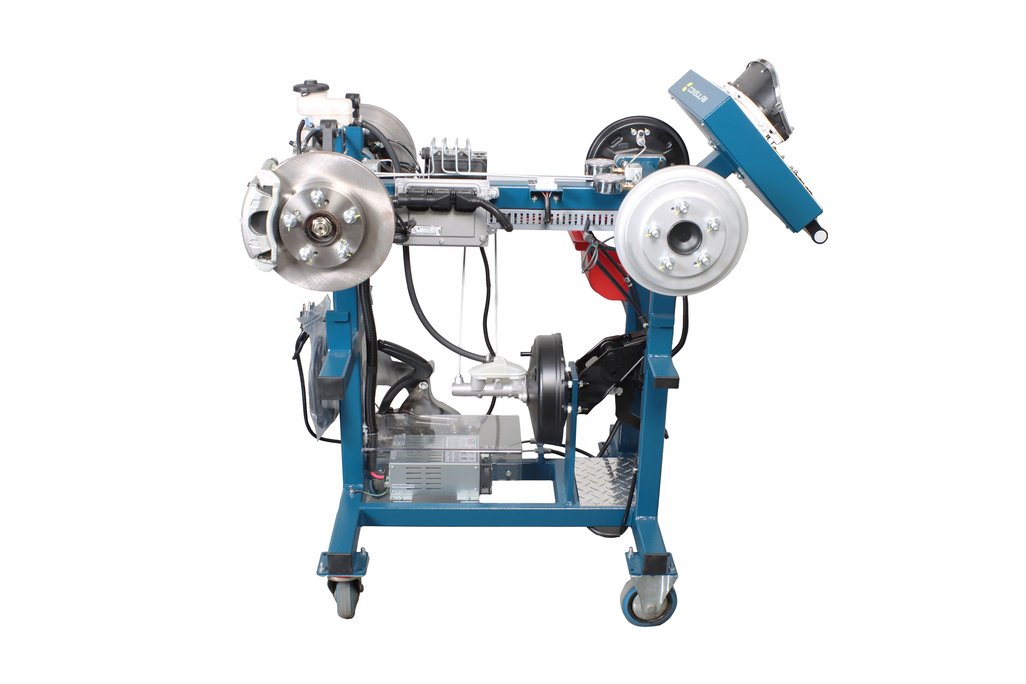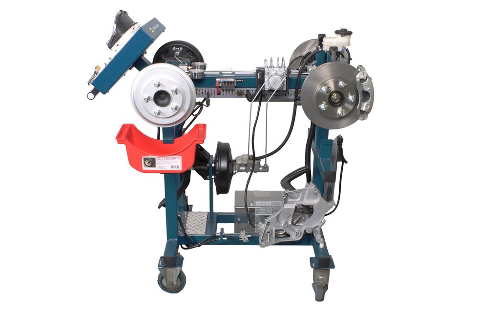 Educational Advantages | Demonstrates full functionality of a 4-wheel ABS system Allows choice of wheel combinations to “lock-up” during ABS operation Allows choice of ABS “application” timing for clearer demonstrations Mechanical faults in the friction components are designed to be diagnosed by students while performing a brake inspection Trainer follows OEM wiring schematics Trainer can be used for full mechanical service and repair operations of front disc brakes, rear drum brakes, master cylinder & hydraulic system (w/ pedal), ABS electrical system (w/ wheel speed sensors), ABS hydraulic control unit and parking brake system Many NATEF and Red Seal tasks can be accomplished using this trainer Trainer can fit through a standard 30” door opening Provides “real world” brake pedal feedback pulsations during ABS operation |