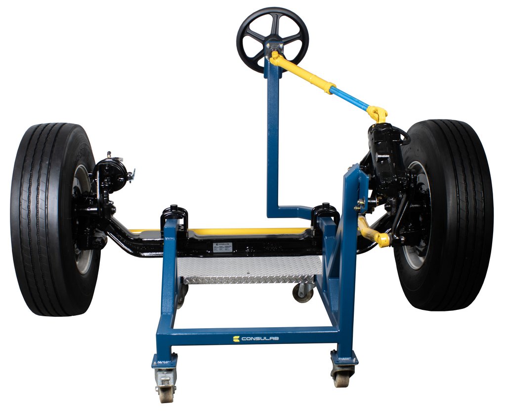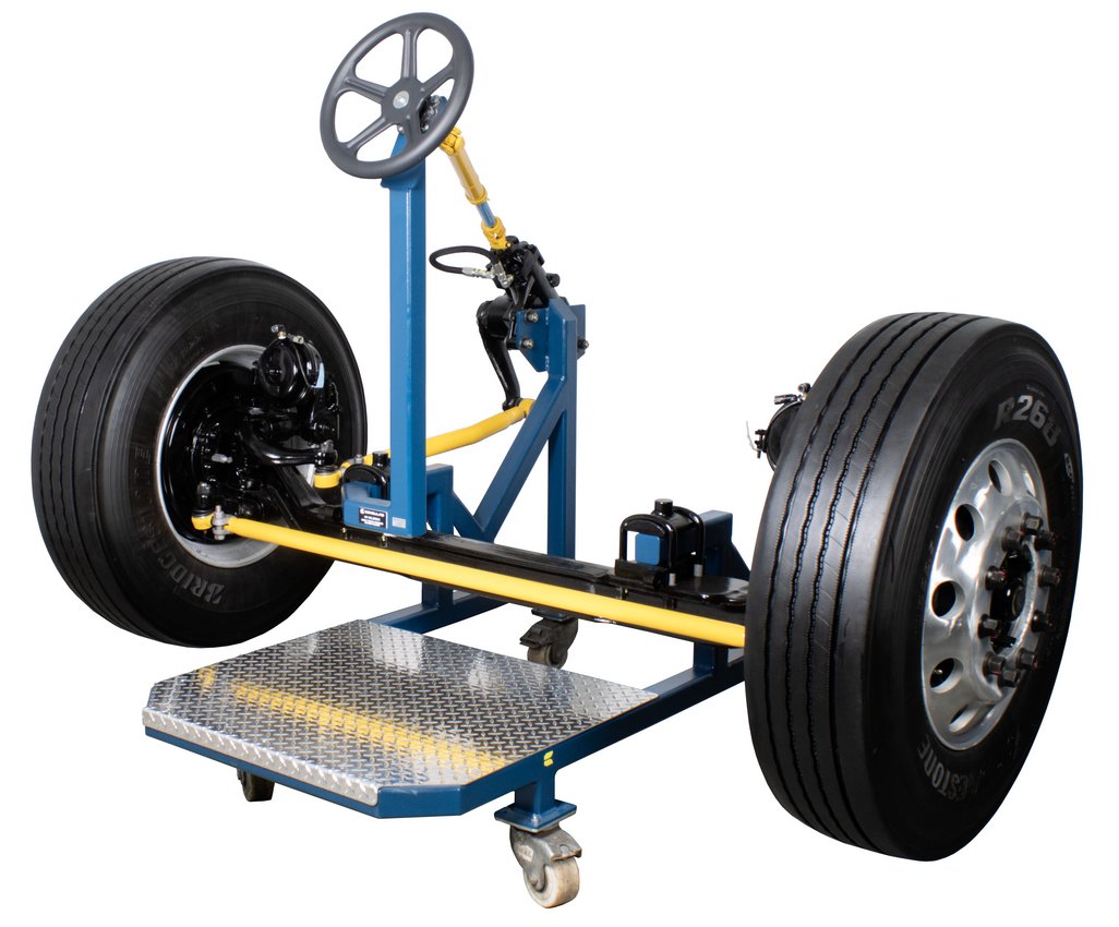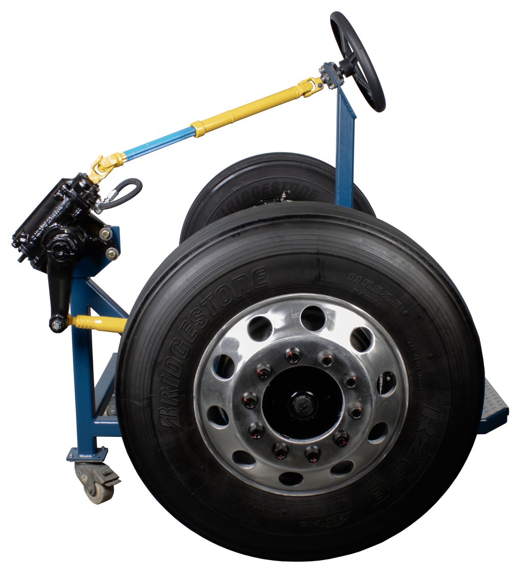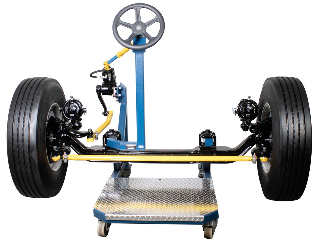 Educational Advantages | Imagine being able to demonstrate to your students the concepts of heavy truck front axle alignment and the importance of proper alignment on drivability, tire wear and fuel consumption, all without the constraints of the hood, radiator, engine and all the other things in your way while instructing. Safety, visibility, and portability are key features of this front axle trainer. Roll it into any classroom with standard size doors. This axle covers a broad range of front axle types for maximum educational value. With the HV-130 you can show, caster, camber, toe, king pin inclination, toe-out on turns, Ackerman angle, steering stops, poppets, and steering geometry. The steering gear is fully operational, without hydraulic power, and operates from stop-to-stop to show the full action of the steering components. This allows stop-to-stop operation without the hazard of hydraulic power steering. Easily measures camber, caster and set toe. Student assignments that follow manufacturer service information and procedures are included in the package. |