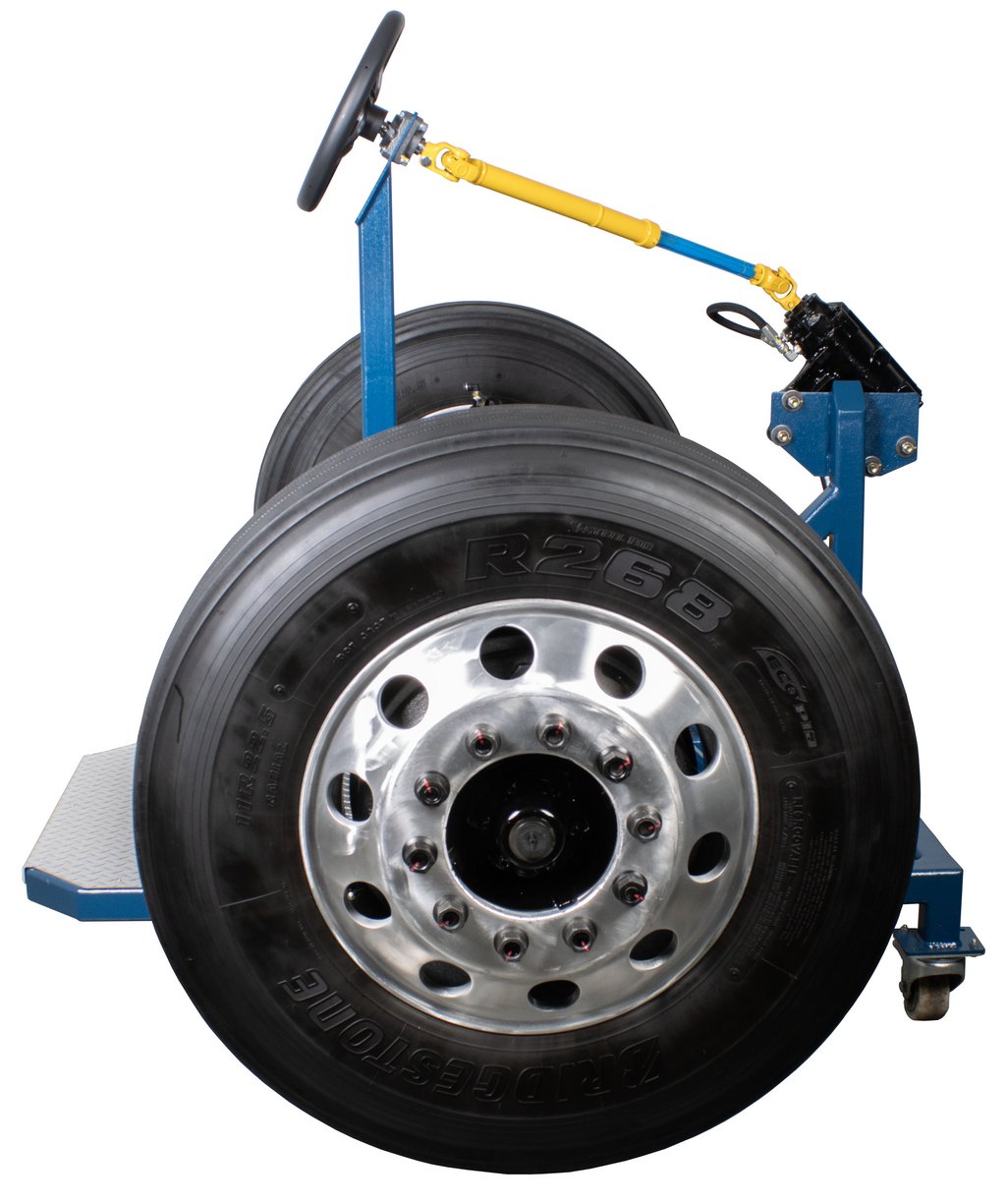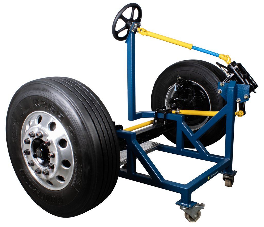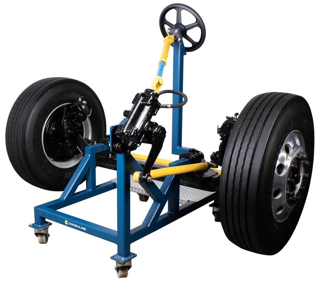 Educational Advantages | Imagine being able to demonstrate to your students the concepts of heavy truck front axle alignment and the importance of proper alignment on drivability, tire wear and fuel consumption, all without the constraints of the hood, radiator, engine and all the other things in your way while instructing. Safety, visibility, and portability are key features of this front axle trainer. Roll it into any classroom with standard size doors. This axle covers a broad range of front axle types for maximum educational value. With the HV-130 you can show, caster, camber, toe, king pin inclination, toe-out on turns, Ackerman angle, steering stops, poppets, and steering geometry. The steering gear is fully operational, without hydraulic power, and operates from stop-to-stop to show the full action of the steering components. This allows stop-to-stop operation without the hazard of hydraulic power steering. Easily measures camber, caster and set toe. Student assignments that follow manufacturer service information and procedures are included in the package. |