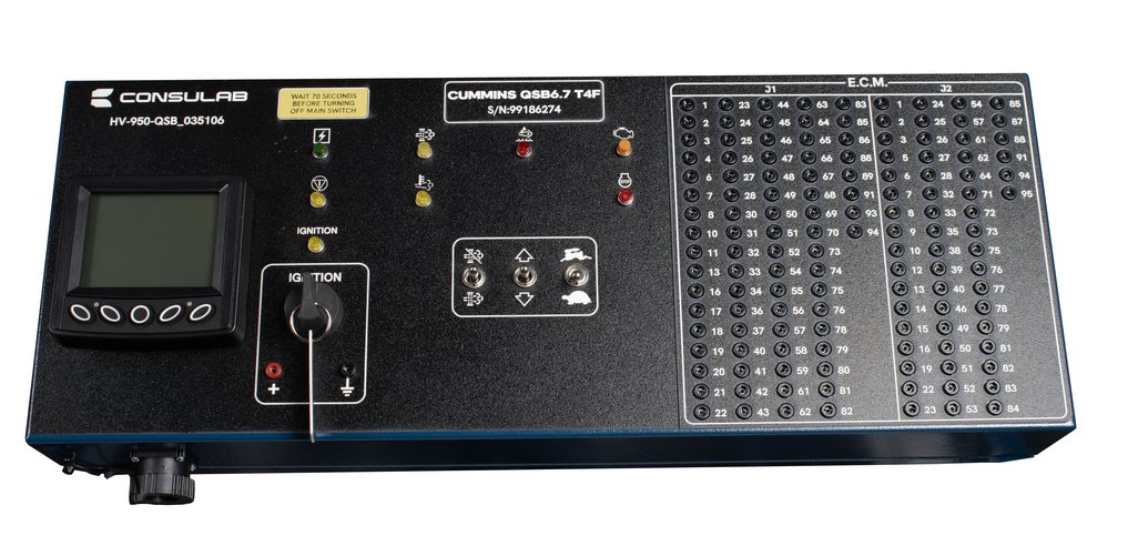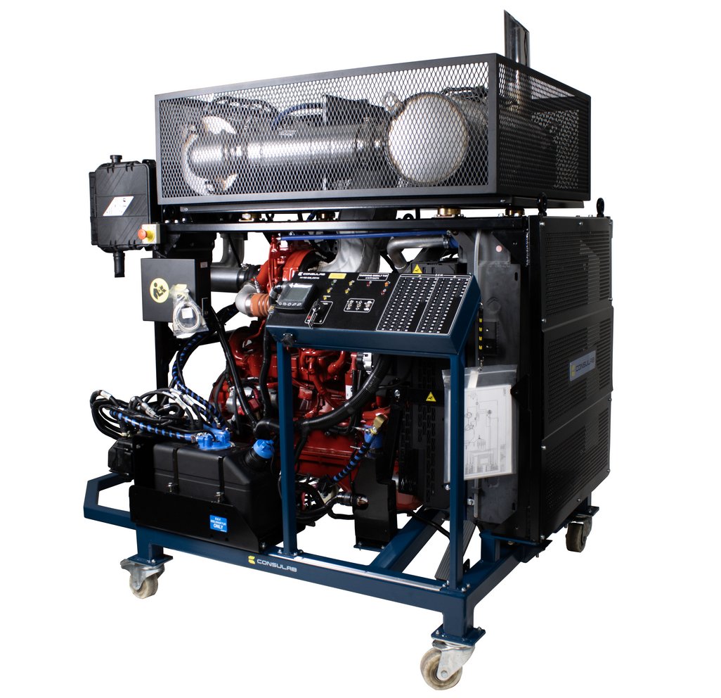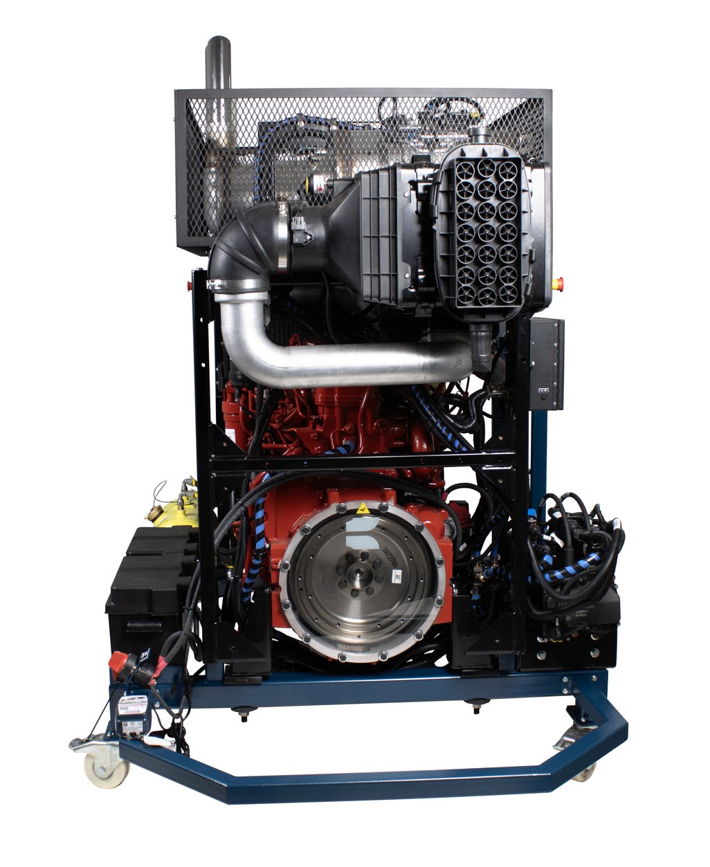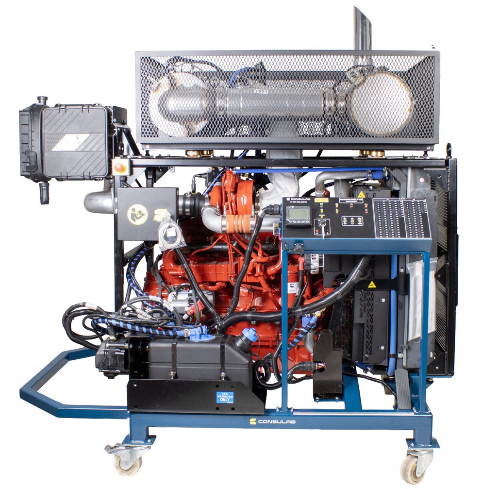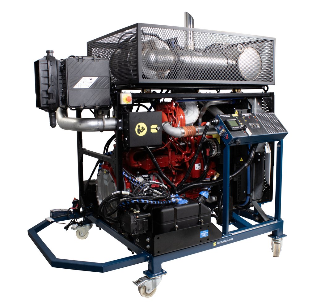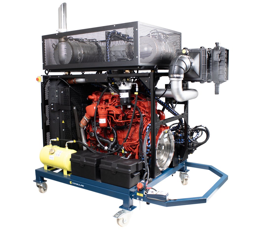 Features | New OEM In-line 6-cylinder, 4-stroke cycle diesel engine Interfaces with OEM diagnostic electronic service tools OEM Engine management system Air intake system with turbocharger and air filter Complete engine cooling system with fan, air-to-air, radiator, and fuel system OEM cold start system OEM ECM and wiring Master control panel with DLC (9-pin J1939 Deutsch connector) with: keyed ignition system with two (2) keys and testing points, indicator lights, enable/disable switches, PTO controls, ECM breakout box with OEM pinout identification, LOFA CANPlus display with J1939 parameters for installed components Complete intake and exhaust system with diesel particulate filter (DPF), maintenance indicators and muffler Engine lubrification system with filters Complete and operable fuse-protected electrical/electronic system (24 VDC) Fuel pedal 22L fuel tank with filters Heavy-duty batteries (2) with smart charger Battery cut-off switch Emergency stop buttons (2) Electronic programmable fault box with 12 faults with intermittent fault capability Safety guards on all rotating components in compliance with CSA regulation Z432-04 and on high temperature components Heavy duty 3” (76.2 mm) powder enamel coated square tubular steel frame Four (2) removable heavy-duty casters, two (2) locking swivel, two (2) fixed |