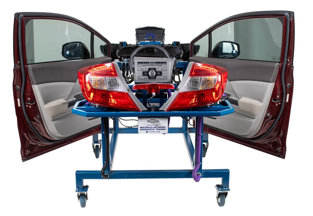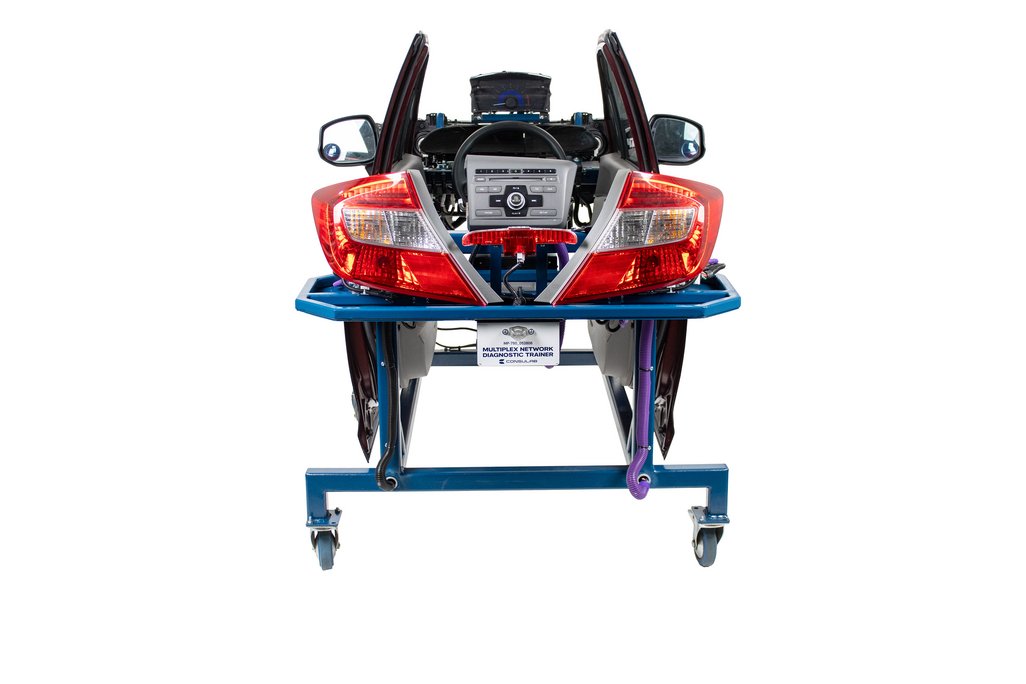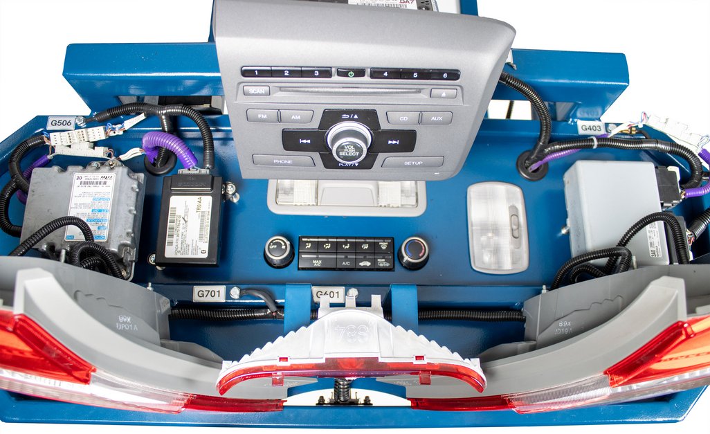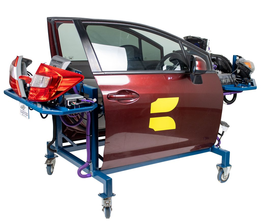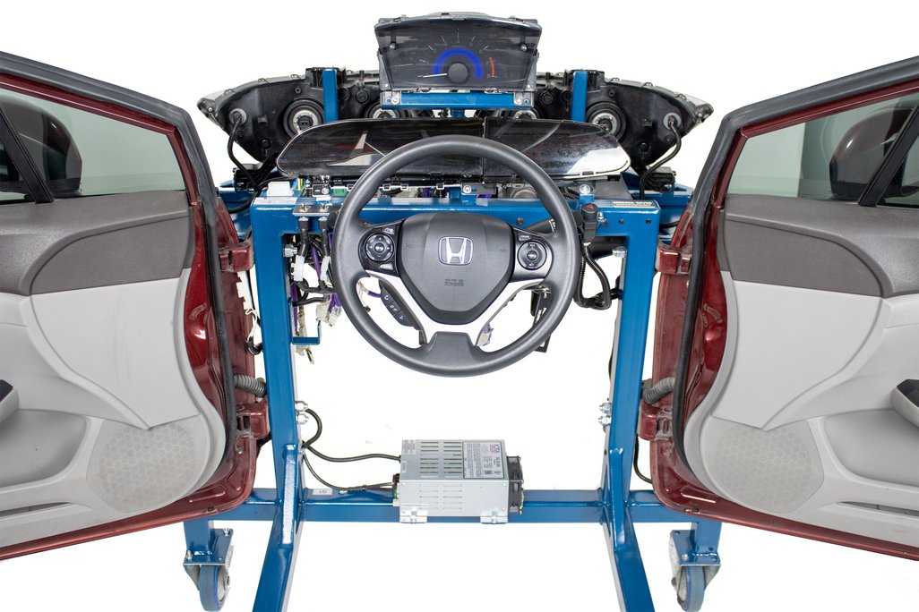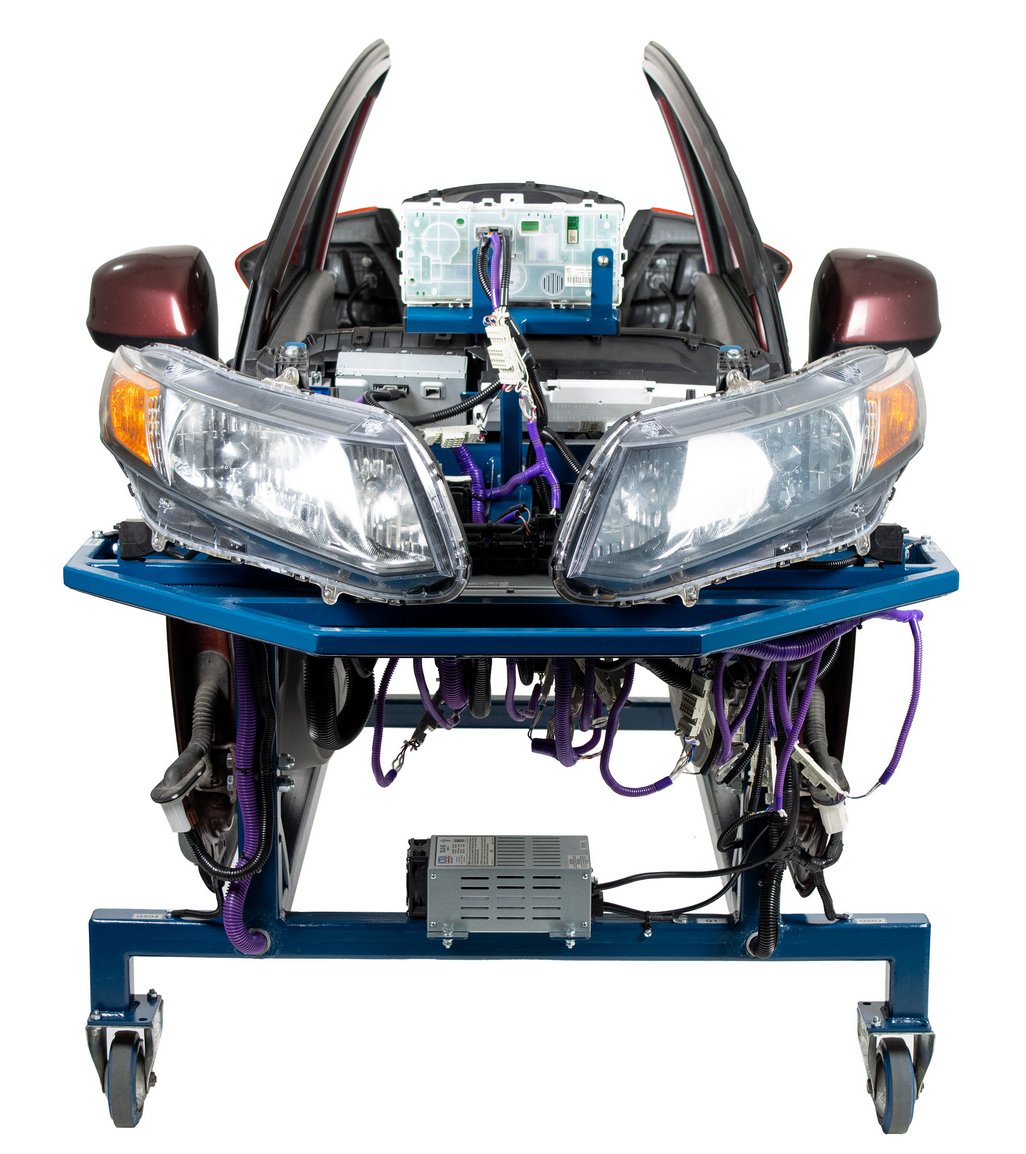 Features | OEM fuse box and power distribution center (matches OEM service information) All OEM components are used – no simulation Provides easy access to all components without limitations of a complete vehicle Integrated 55A power supply 120VAC/12VDC 60Hz (operates on a standard 15A receptacle circuit) Sturdy powder coated metal frame Compact and fits through standard door openings Manual fault box with 12 selectable system faults |