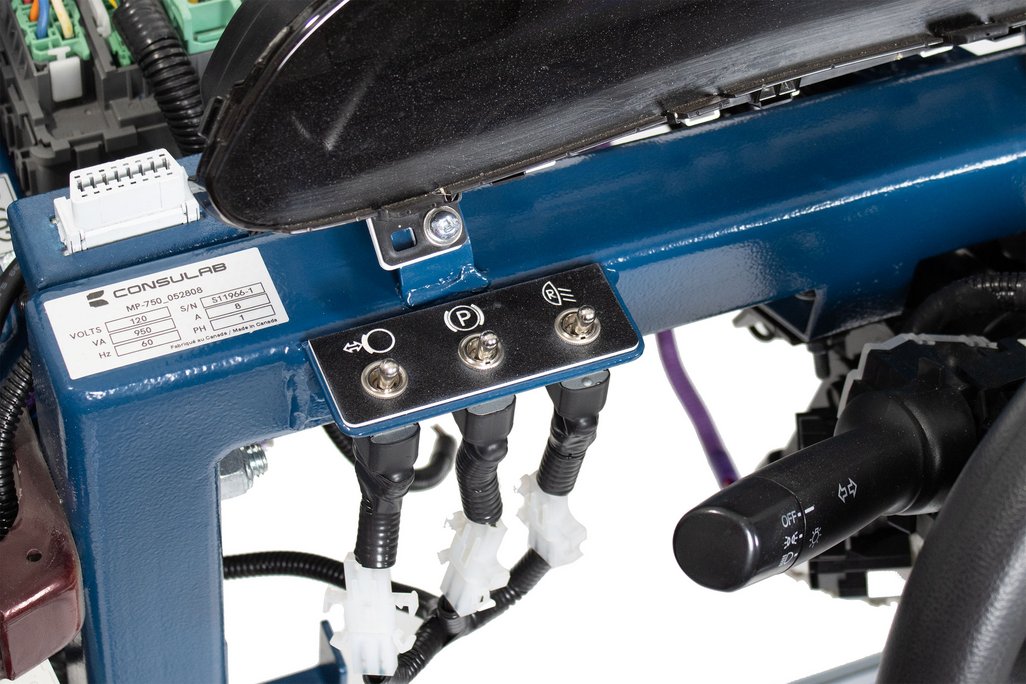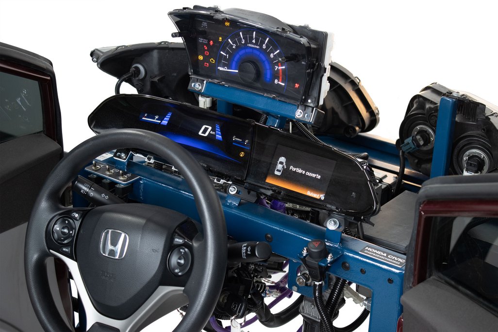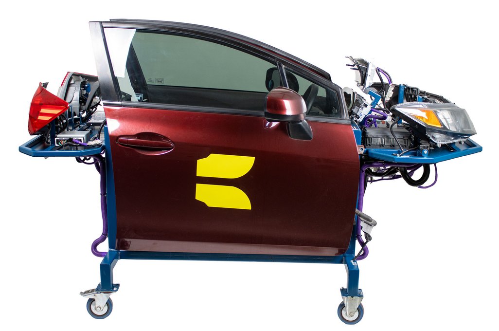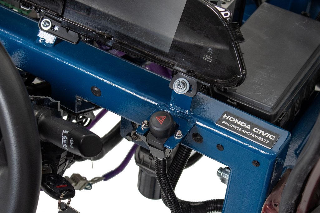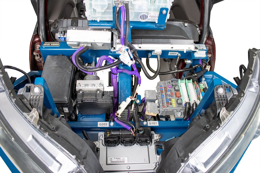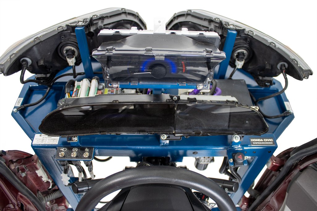 Features | OEM fuse box and power distribution center (matches OEM service information) All OEM components are used – no simulation Provides easy access to all components without limitations of a complete vehicle Integrated 55A power supply 120VAC/12VDC 60Hz (operates on a standard 15A receptacle circuit) Sturdy powder coated metal frame Compact and fits through standard door openings Manual fault box with 12 selectable system faults |
