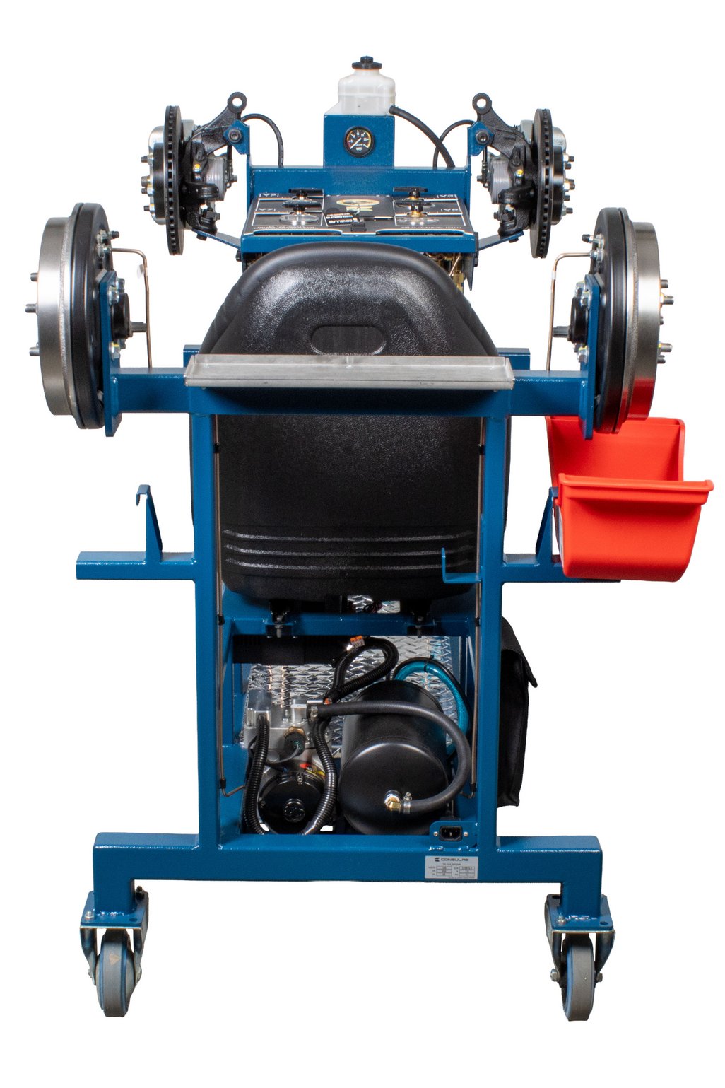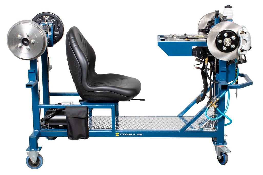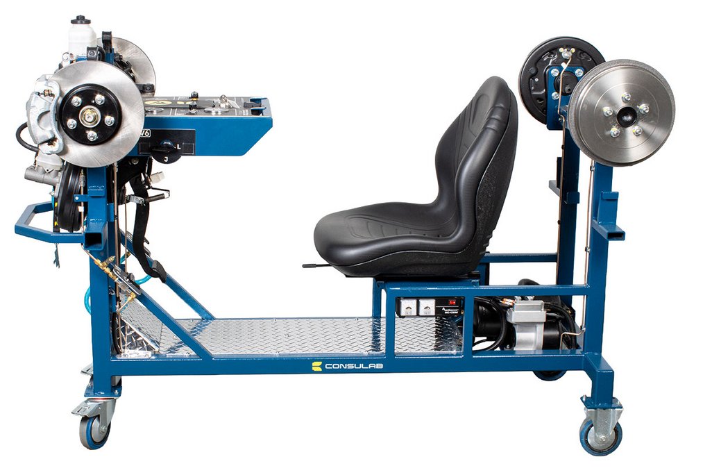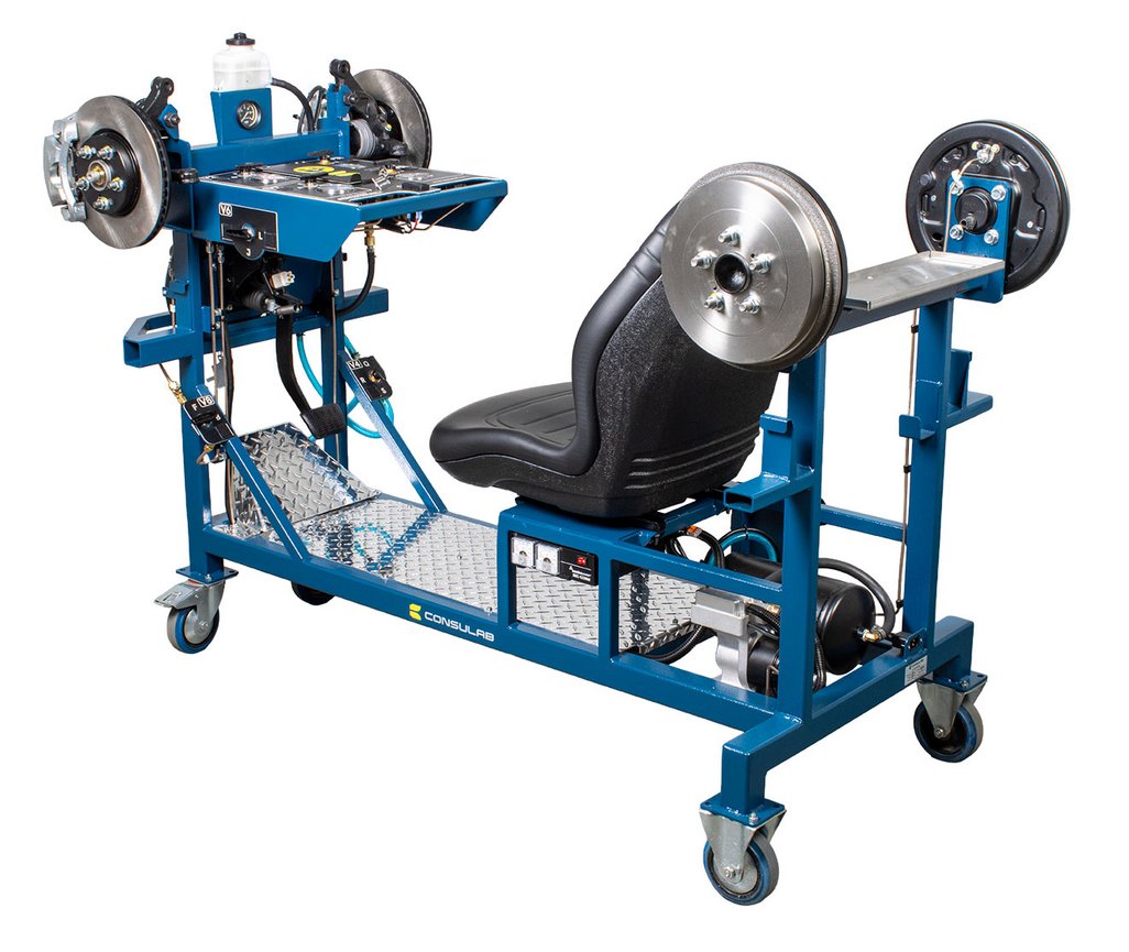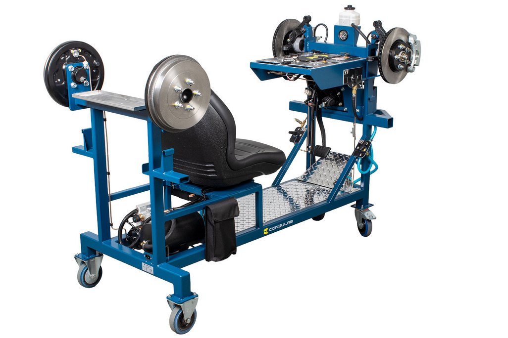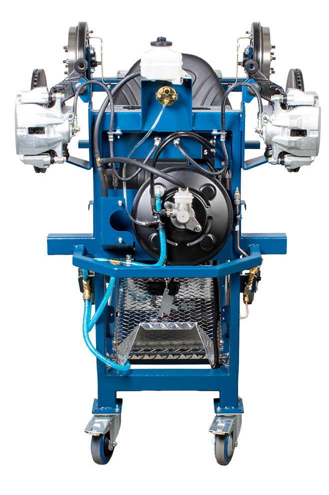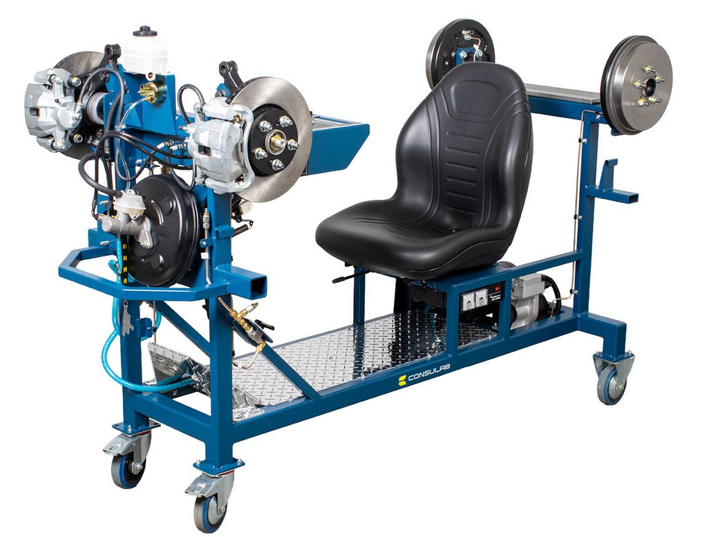 Features | “Real” Toyota OEM components: master cylinder, booster, pedal, disc and drum brakes Built-in driver seat for realistic pedal feel Hydraulic pressure gauges at each wheel Four (4) hubs equipped with brakes (discs or drums) NOTE: Discs, drums, wheel cylinders, calipers, pads and master cylinder are new. All other OEM components are recycled from actual vehicles 120 VAC, 7.5 A power supply included Ability to introduce air into the system with a built-in fault and bleed the system Simulation of common problems: internal master cylinder leak, blocked or restricted hose Functional vacuum pump with adjustable restriction Non-hazardous brake fluid Sturdy powder coated metal stand with two locking swivel and two fixed casters for easy transport Trainer can fit through a standard 30” door opening |