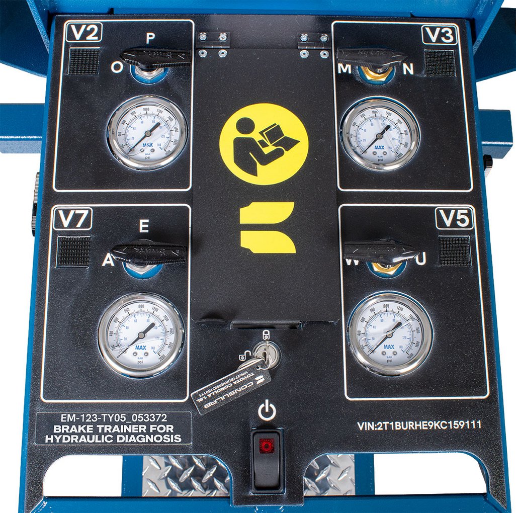 Educational advantages | Trainer can be used for teaching and assessing skills in maintaining, diagnosing, and repairing Toyota hydraulic brake systems Simulates multiple pedal sensations: normal, soft (air), hard (lack of assist), and internal leak (master cylinder) Allows lash adjustment of brake booster tappet with a special tool Incorporates pressure gauges and allows the use of hydraulic force gauges for performance analysis Reproduces real mechanical faults for learning brake pedal feel and diagnosis Provides a safe, hands-on experience without hazardous fluids Many NATEF and Red Seal tasks can be accomplished using this trainer |