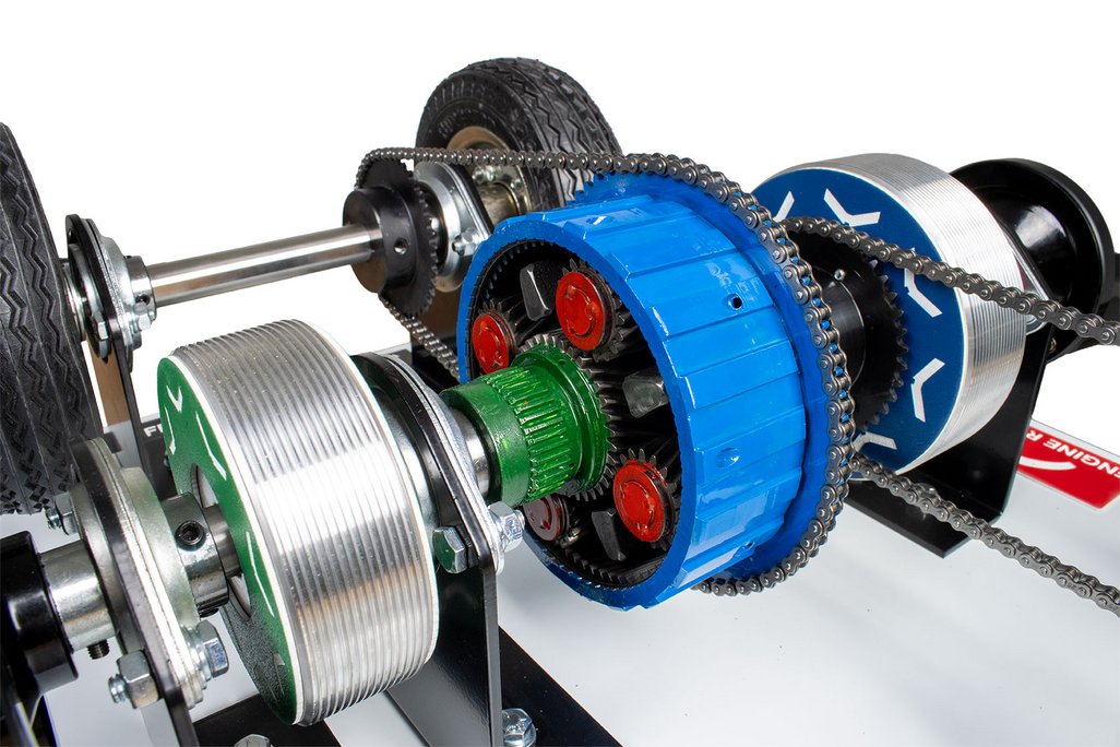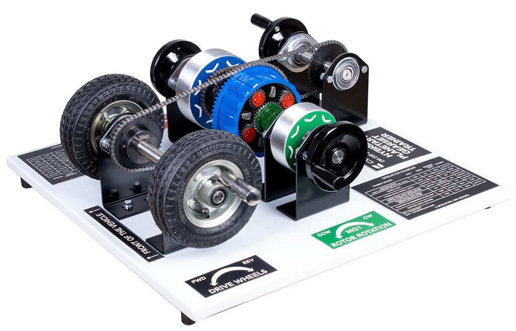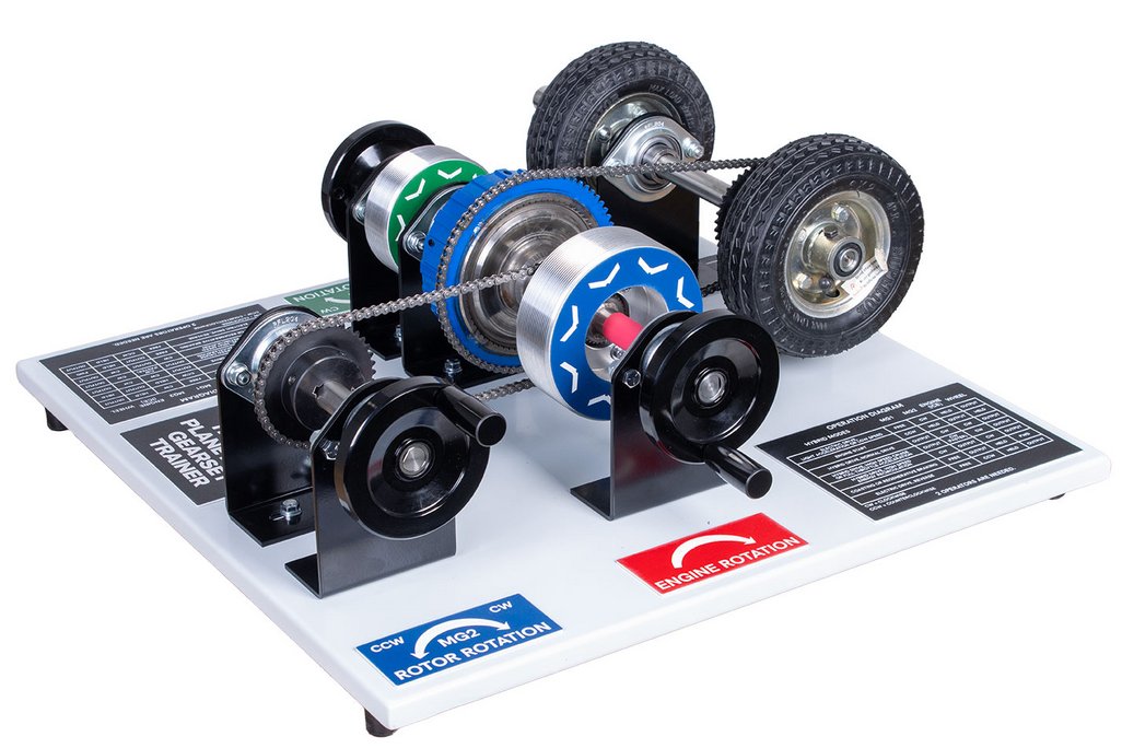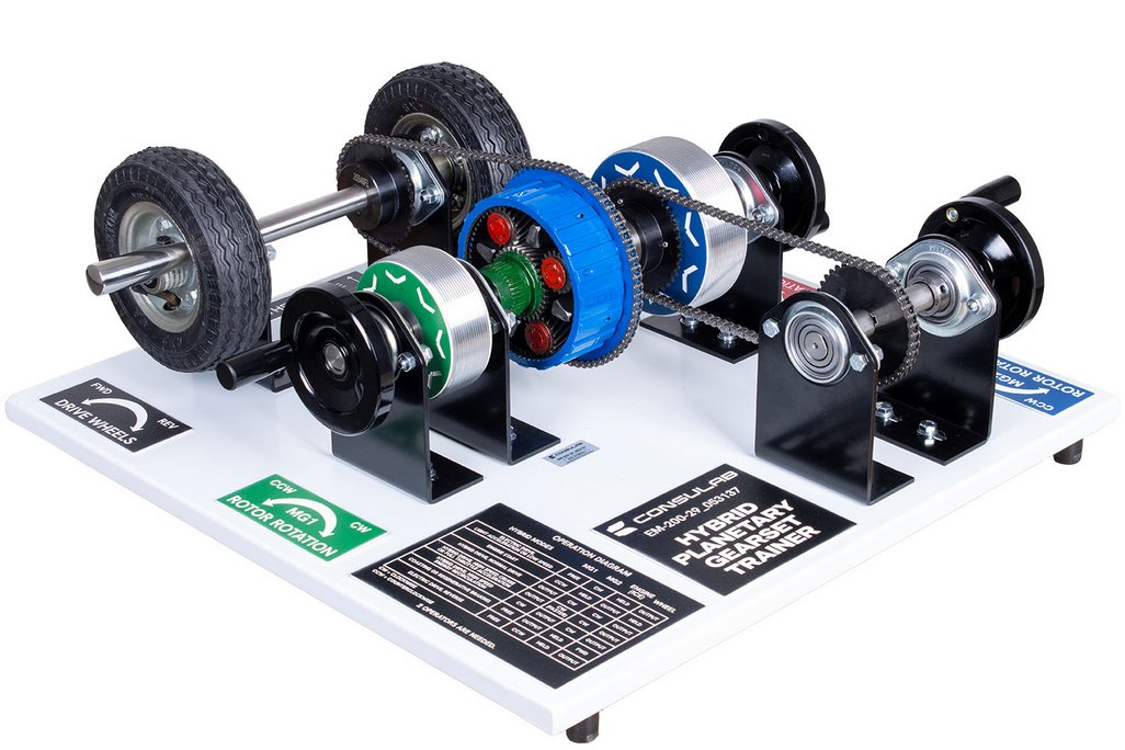 Educational Advantages | Clearly demonstrates the operation of ICE, MG1, MG2 and Drive wheels in all vehicle modes. Students are required to be “part of the driveline operation” by turning hand cranks or holding devices which increases their engagement and involvement. Trainer provides a significant educational tool that clearly demonstrates the complex operation of a hybrid drivetrain using a power split device. Makes all major hybrid drivetrain components clearly visible which are normally not accessible in the vehicle. |