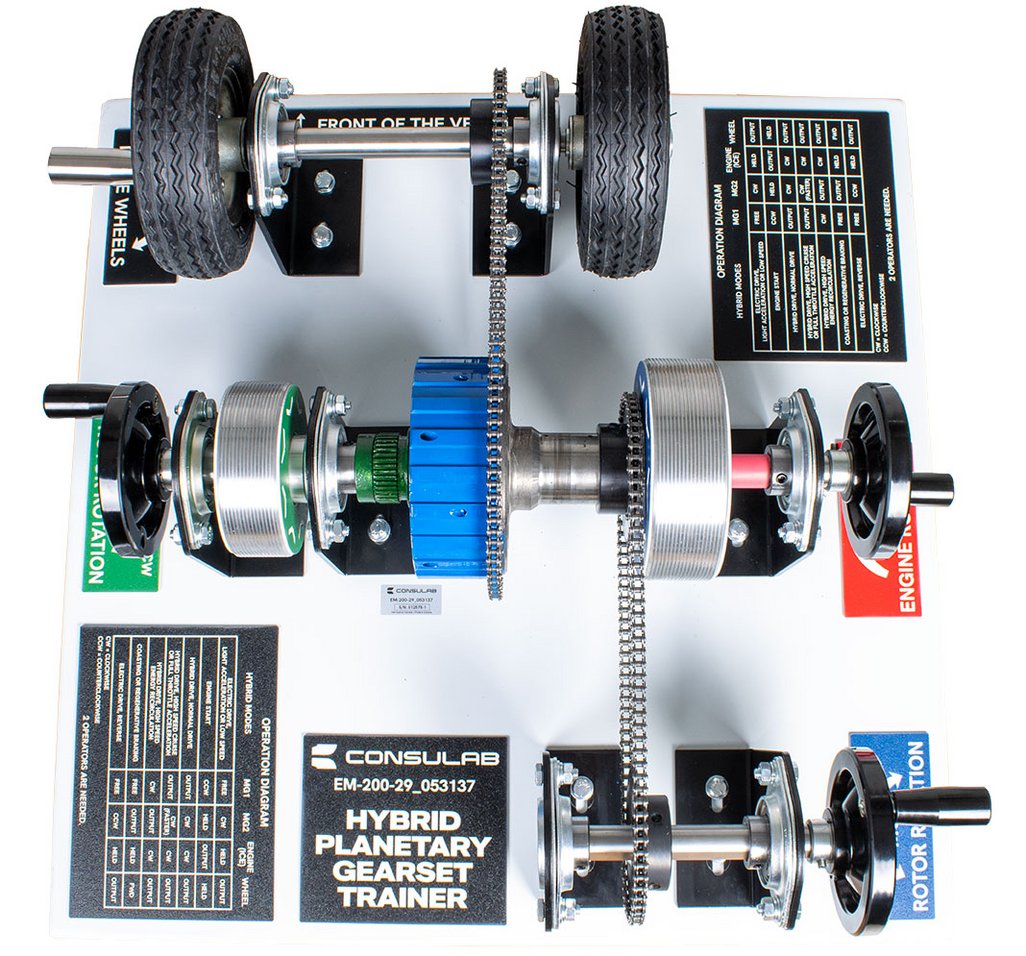Features | The EM-200-29 trainer is designed to have students manually rotate, hold or release each component using hand cranks. An OPERATION DIAGRAM on the trainer gives instructions as to the status of each component during operational modes. Clearly demonstrates the operation of ICE, MG1, MG2 and Drive wheels in all vehicle modes. The OPERATION DIAGRAM identifies which component is held, driven and/or spins freely in each mode. Students either hold or turn hand cranks to demonstrate each mode. This allows full visualization of each mode for better understanding of system operation. Each of the four components will react exactly as it does in the vehicle including changes in the direction of rotation of MG1. Diagnostic scenarios can also be created for example by showing what would happen if MG1 fails. In some modes, two students are required to operate all components on the trainer. Clear representation of driveline components including ICE, MG1, MG2 and Drive wheels. Hand cranks and drums that are used by students to either drive or hold components to demonstrate each operational mode. |
