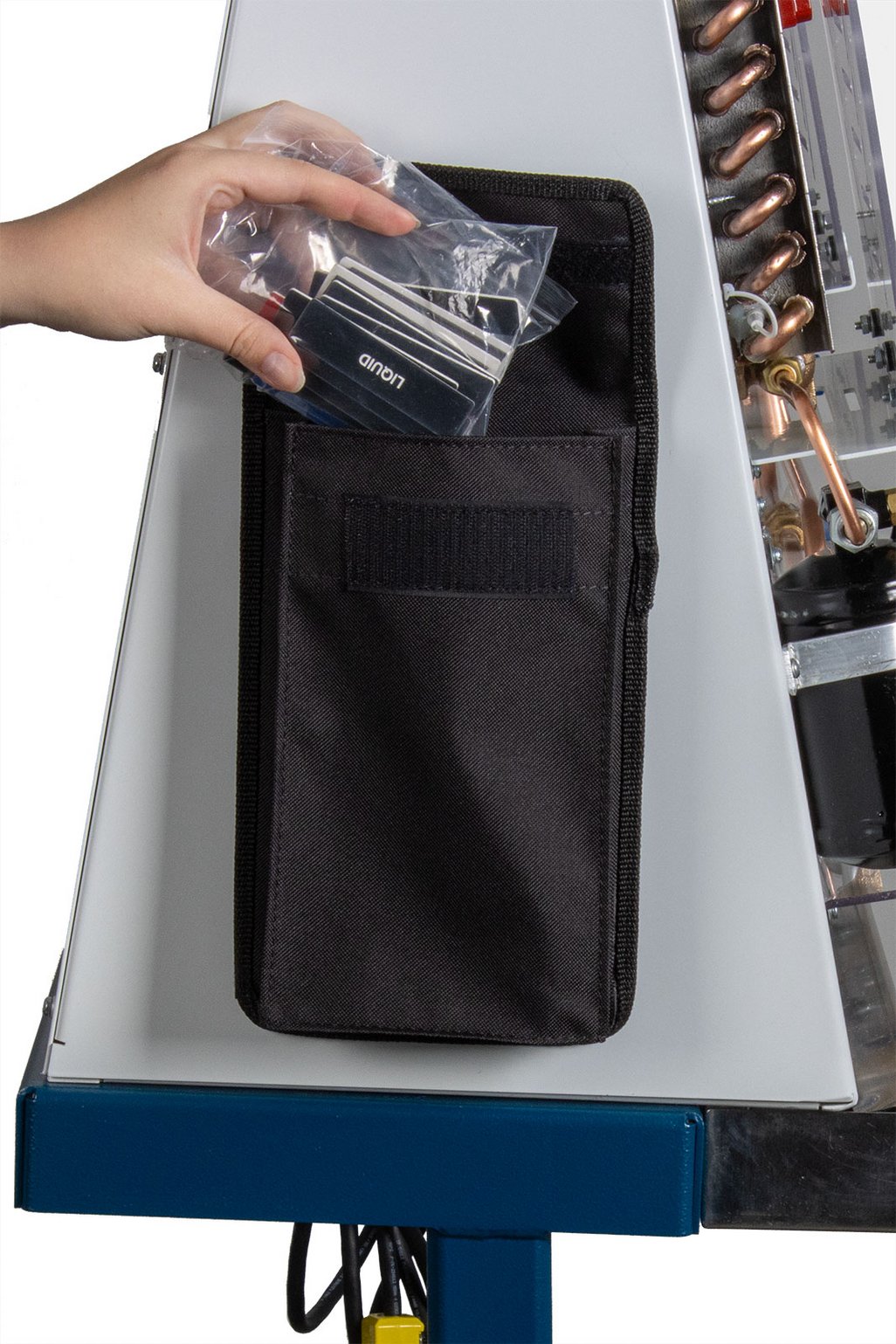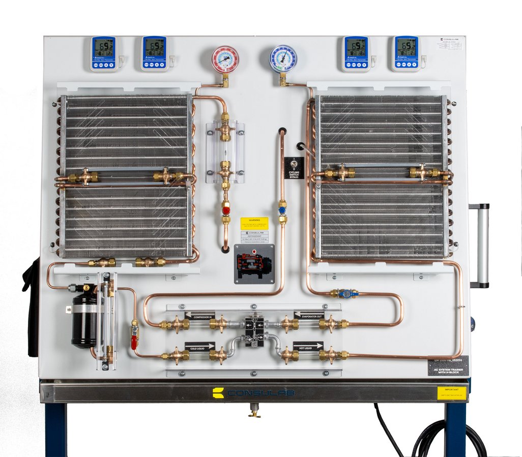 Features | OEM R134a service ports High and Low side A/C pressure gauges Adjustable temperature control switch for evaporator temperature levels Digital thermometers (4) at inlet and outlet of evaporator and condenser Internally protected hermetically sealed A/C compressor A/C compressor has manual starter with internal thermal protection High pressure (300psi) safety switch shuts off compressor Adjustable 3-speed evaporator (1) and condenser (2) fans Cycling switch bypass toggle switch Stainless steel condensate drip pan with drain Power “ON” indicator light Removable magnetic component name and refrigerant flow arrow labels Includes an operation manual and instructors guide in hard copies, as well as student assignments and answer key available in PDF format. |