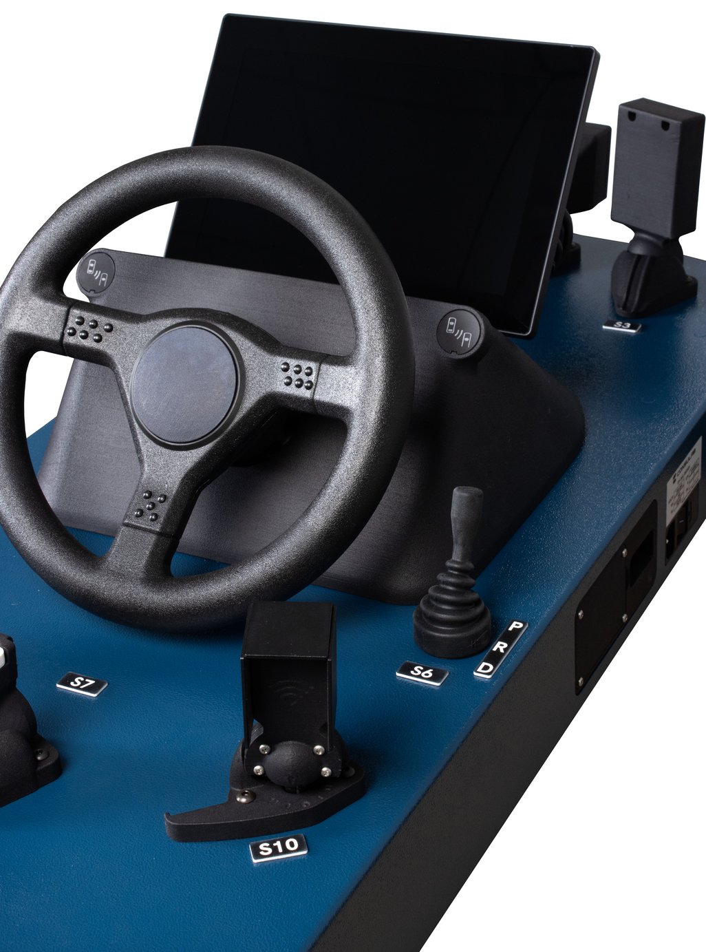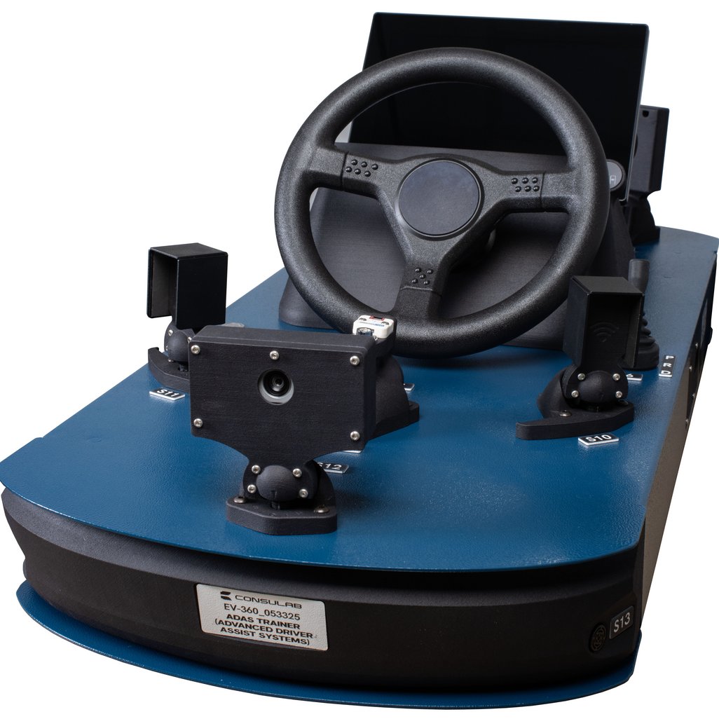 Features | The trainer is a scale model, providing the visual cues of where the components are typically found on an actual vehicle, helping the students to recognize design function and orientation. It incorporates a 10” X 6” tablet display with EXPLORE or DRIVE mode viewing options. These choices allow either an overall view of a composite vehicle illustrating the location of all the ADAS sensors. |